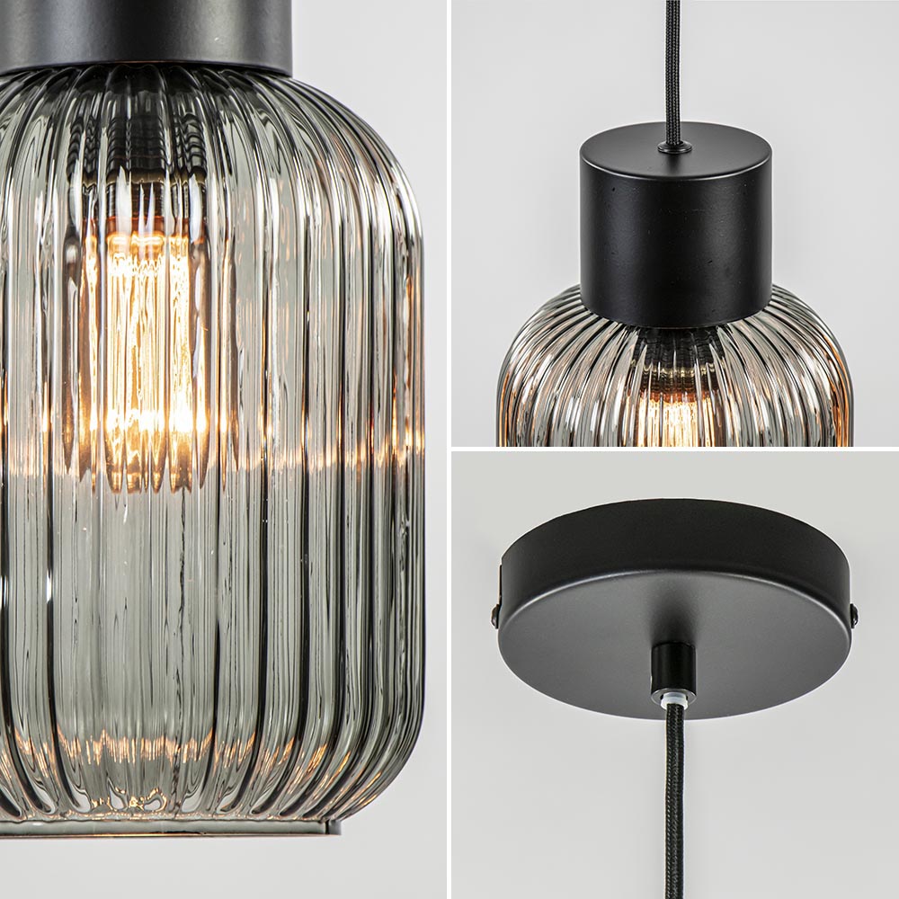 – hoogte: 175 cm – kap: Ø15×20 cm – fitting: Ø8×6,5 cm – bevestiging: Ø11×2,5 cm – metaal, mat zwart – smoke glas – dimbaar (exclusief) – exclusief lichtbron (E27) – gewicht: 1,5 kg