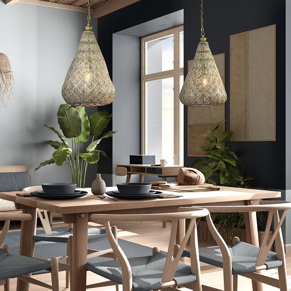 Deze grote hanglamp is een mooie eyecatcher en zorgt voor een fijne sfeer in de kamer. De hanglamp 2-lichts mat goud/zwart is zeer gedetailleerd afgewerkt. Kenmerkend aan de oosterse stijl, is de afwerking van de metalen lampenkappen. Karakteristiek zijn de kleine gaatjes die in het metaal zijn gemaakt, die ook bij deze hanglamp 2-lichts terug te zien zijn. Het maakt niet alleen het uiterlijk van deze Oosterse hanglamp fraai, maar ook het licht wat hij uitstraalt in uw kamer. De kappen zijn in hoogte verstelbaar, wat deze hanglamp goud/zwart geschikt maakt voor boven bijna elke eettafel! De hanglamp 2-lichts Oosters goud/zwart wordt geleverd exclusief dimmer en lichtbronnen. De lamp is echter wel dimbaar. De zwarte balk geeft de hanglamp een stoere landelijke uitstraling.