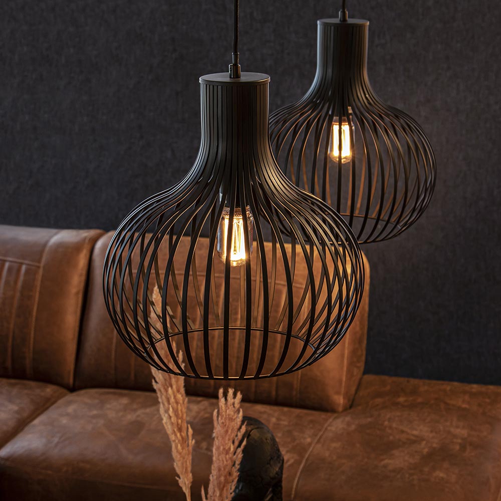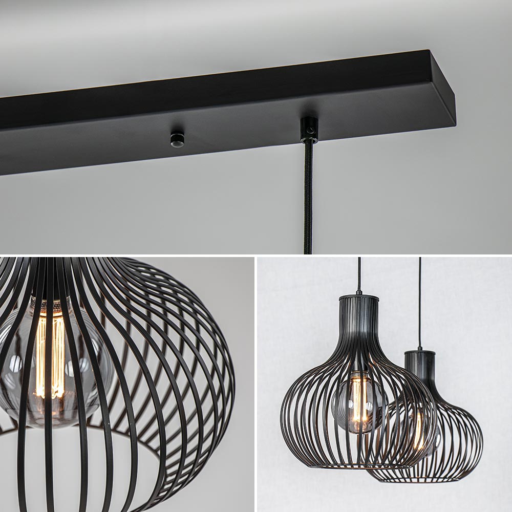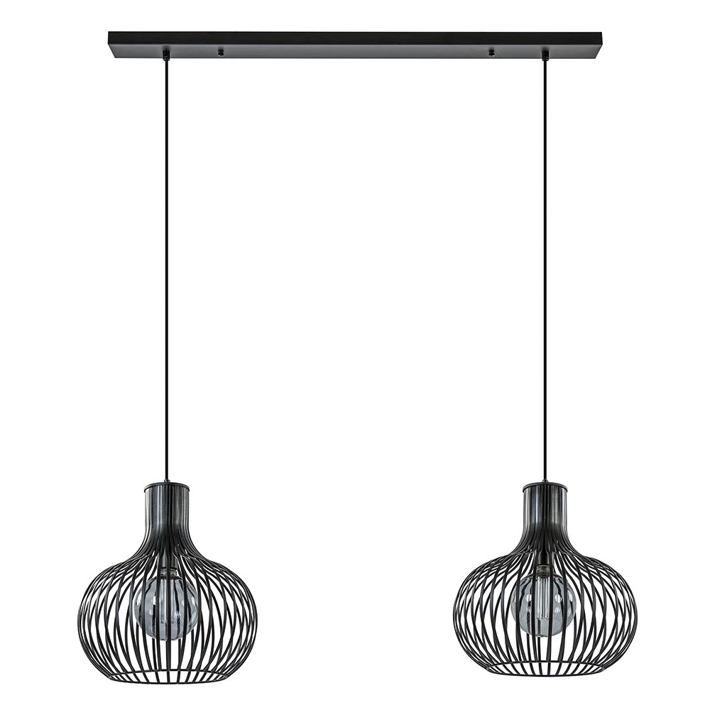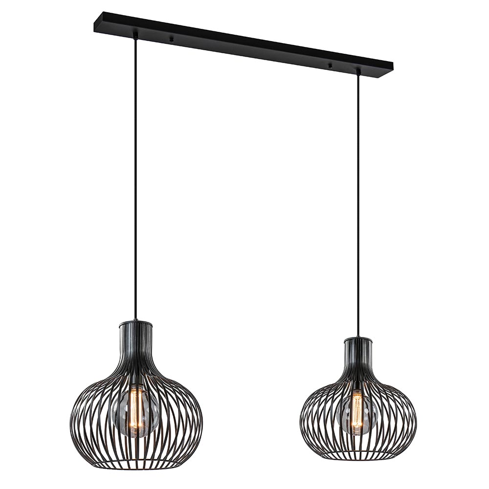 Een sfeervolle toevoeging aan uw eetkamer of keuken. Deze moderne 2-lichts hanglamp zorgt door de open structuur voor een fijne lichtverspreiding die met de juiste lichtbron ook direct zorgt voor de juiste sfeer. De hanglamp is voorzien van twee metalen draadkappen die zijn afgewerkt met een mat zwarte finish. De kappen zijn ui-vormig en hangen aan zwarte stof omwonden snoeren die naar wens zijn in te korten. De maximale hoogte van de 2-lichts hanglamp is 195 cm zodat deze ook geschikt is voor een ruimte met een hoog plafond. De draad hanglamp wordt aan het plafond bevestigd met een mat zwarte balk van 90 cm om het geheel af te maken.