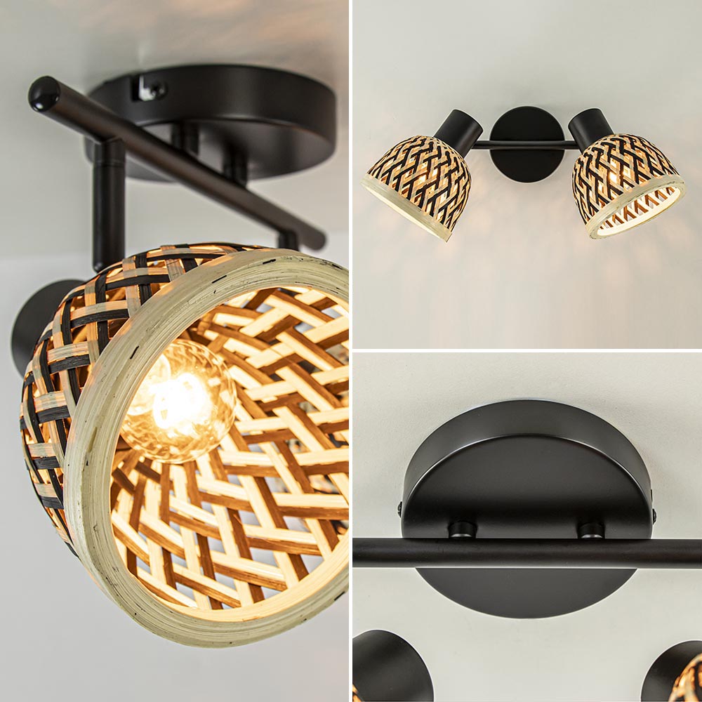 Super leuk als plafondlamp in een hal of slaapkamer, maar ook te gebruiken als wandlamp. Deze lamp is een leuke toevoeging aan het interieur. De plafondlamp heeft een mat zwart metalen armatuur dat is gecombineerd met bamboe kappen in de kleur naturel en zwart. De combinatie maakt de plafond/wandlamp prima geschikt voor woonstijlen als landelijk, botanisch of Scandinavisch. De kapjes zijn naar wens te verstellen door deze te draaien en/of te kantelen. De wand/plafondlamp wordt geleverd zonder lichtbron.