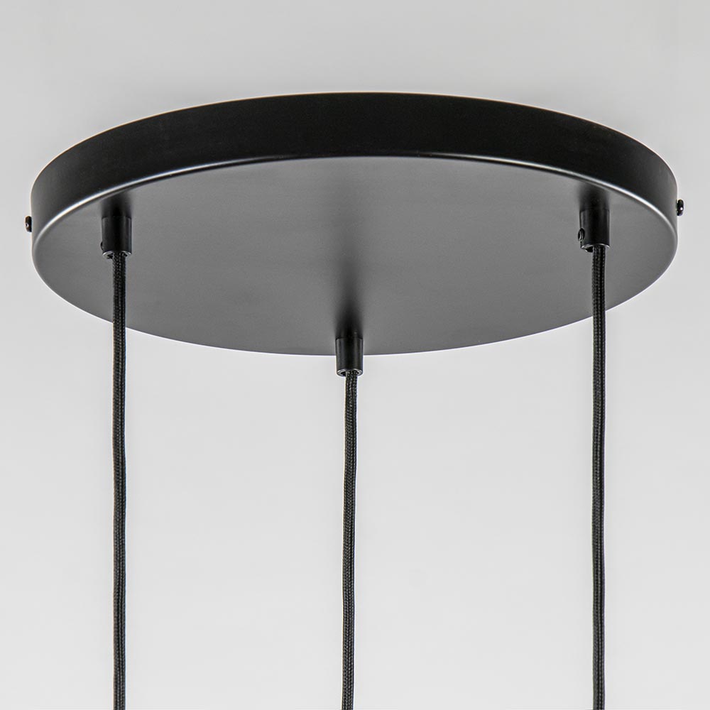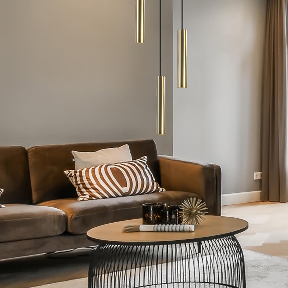 Ideaal voor in een hal, boven een ronde eettafel of als sfeerlicht in de woonkamer. Waar deze lamp ook hangt, het is een heuse sfeermaker. De ronde 3-lichts hanglamp wordt met een plafondplaat van 30 cm doorsnede bevestigd op het plafond. Op de plaat zijn 3 lichtpunten evenredig verdeeld. Ieder punt is voorzien van een zwart stof omwonden snoer met daaraan een gouden metalen cilinder. De cilinders zijn naar wens op hoogte te hangen met een maximale hoogte van 130 cm. Doordat de cilinders vooral werken als downlighter wordt het oppervlak onder de lamp goed uitgelicht. Hoe hoger de cilinders hangen, hoe breder het oppervlak onder de lamp wordt uitgelicht. De lichbron is ook in de cilinder in hoogte te verstellen. De ronde 3-lichts hanglamp cilinders is dimbaar middels een externe dimmer (exclusief).