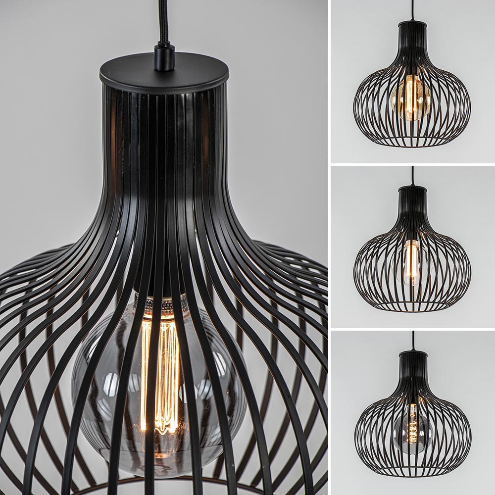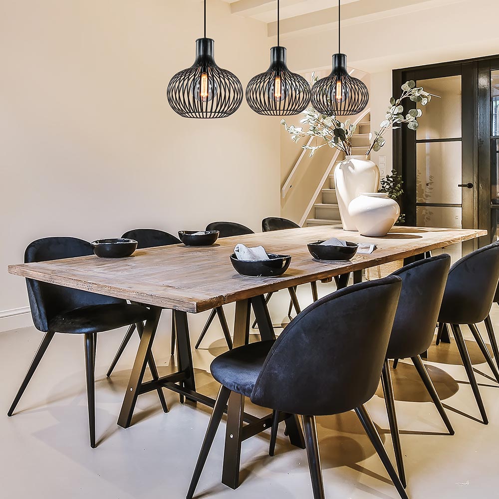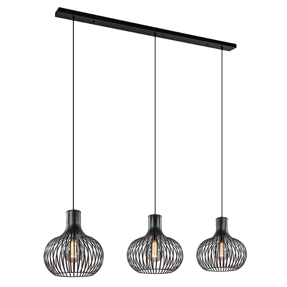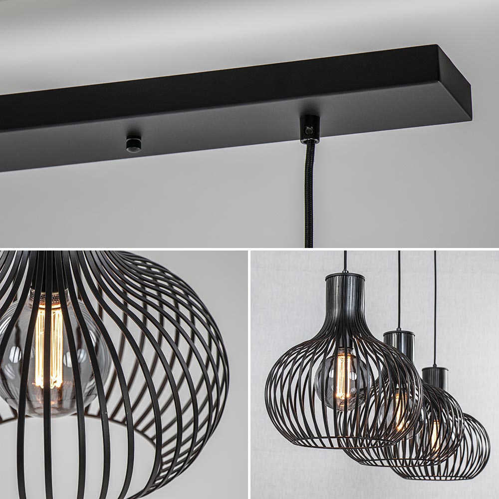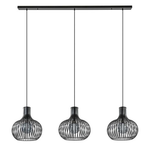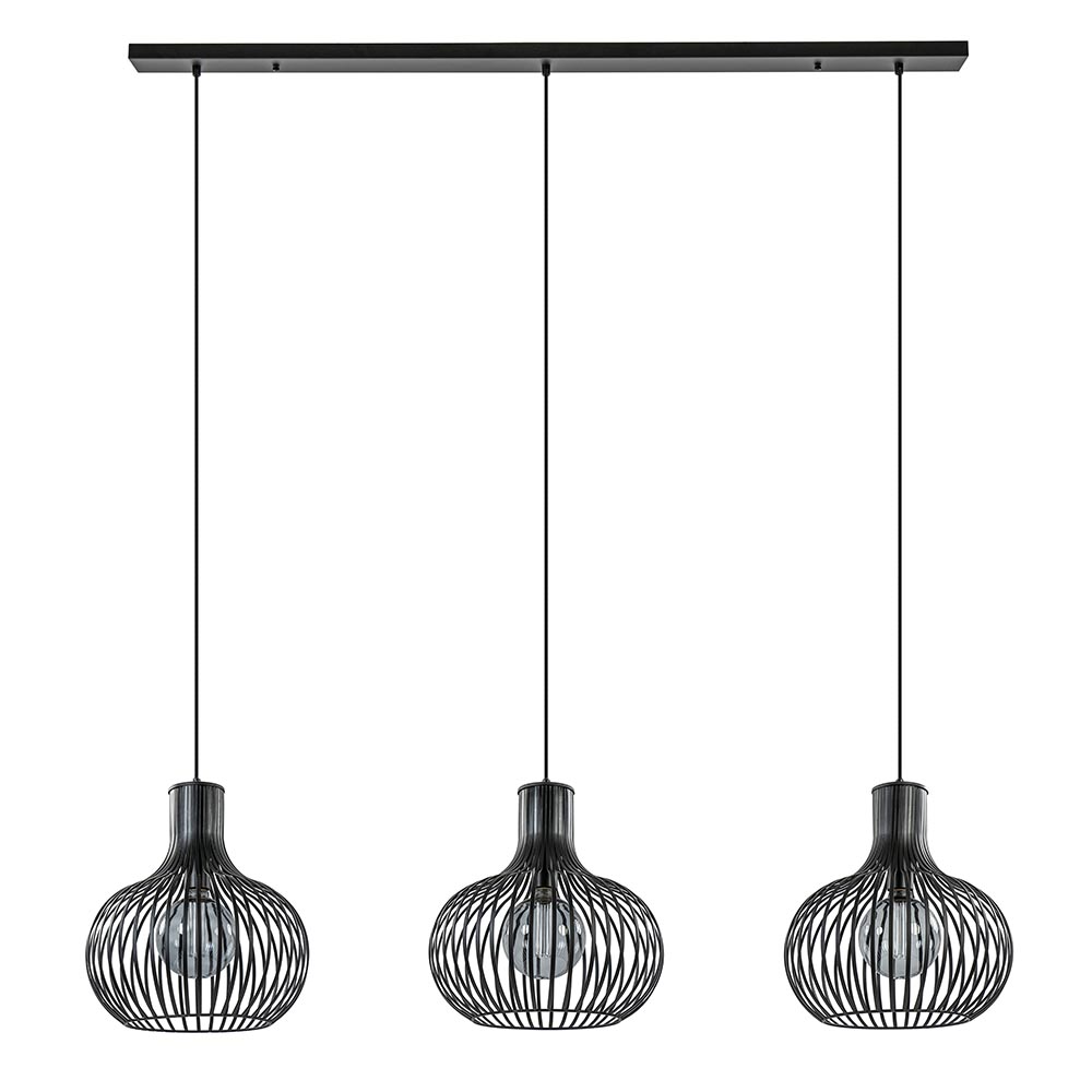 Een sfeervolle toevoeging aan uw eetkamer of keuken. Deze moderne 3-lichts hanglamp zorgt door de open structuur voor een fijne lichtverspreiding die met de juiste lichtbron ook direct zorgt voor de juiste sfeer. De hanglamp is voorzien van drie metalen draadkappen die zijn afgewerkt met een mat zwarte finish. De kappen zijn ui-vormig en hangen aan zwarte stof omwonden snoeren die naar wens zijn in te korten. De maximale hoogte van de 3-lichts hanglamp is 195 cm zodat deze ook geschikt is voor een ruimte met een hoog plafond. De draad hanglamp wordt aan het plafond bevestigd met een mat zwarte balk van 130 cm om het geheel af te maken.