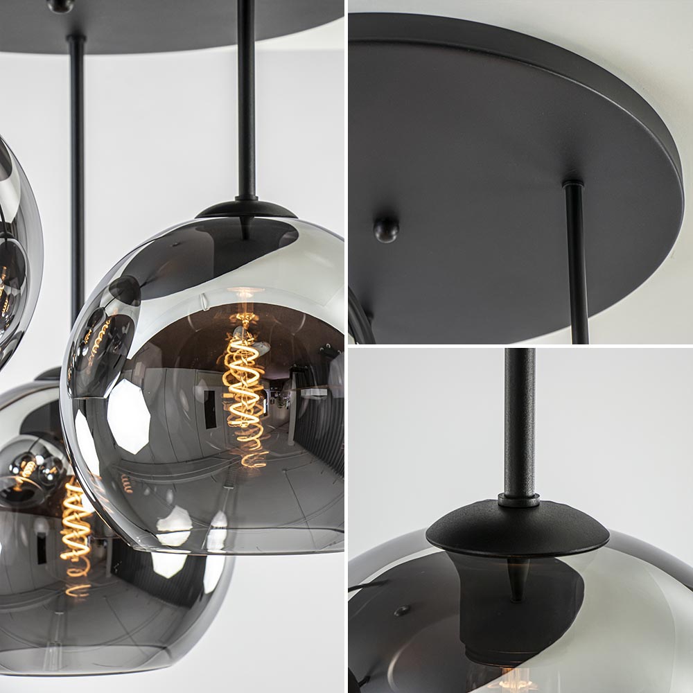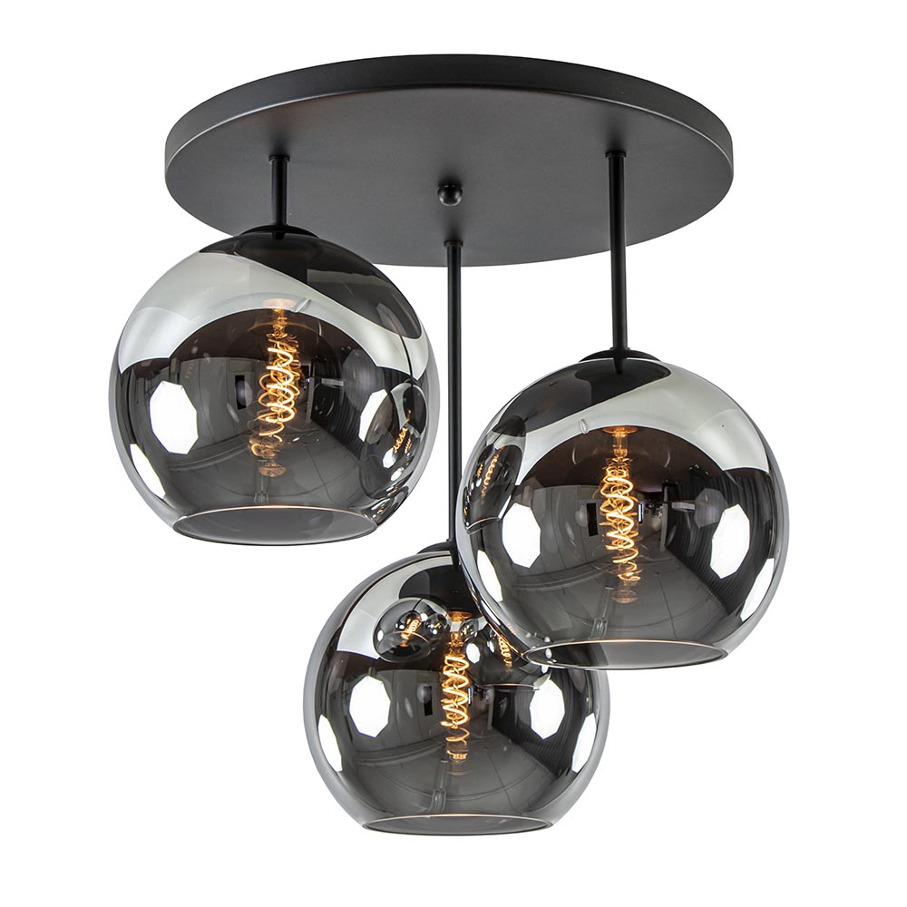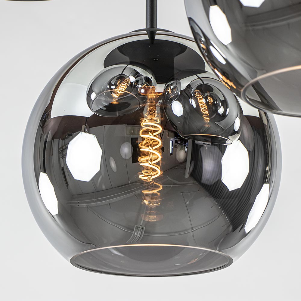 Met deze plafondlamp brengt u een luxe, modern en retro gevoel in huis. De 3-lichts plafondlamp is een mooie toevoeging voor een hal, woonkamer of slaapkamer. De plafondlamp heeft een grote plafondplaat waar 3 lichtpunten op zijn gemonteerd. Deze zijn verdeeld over diverse hoogtes voor een speels effect. De smoke/titanium glazen bollen geven een plafondlamp een luxe uitstraling. Het glas is enerzijds spiegelend, en anderzijds donker transparant, oftewel smoke. De grote plafondlamp heeft een hoogte van 52 cm en is dimbaar middels een externe dimmer (exclusief).