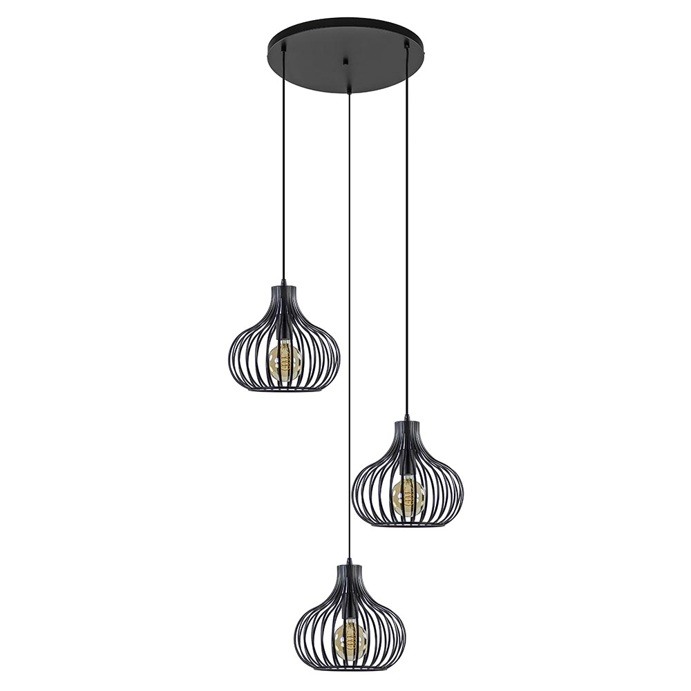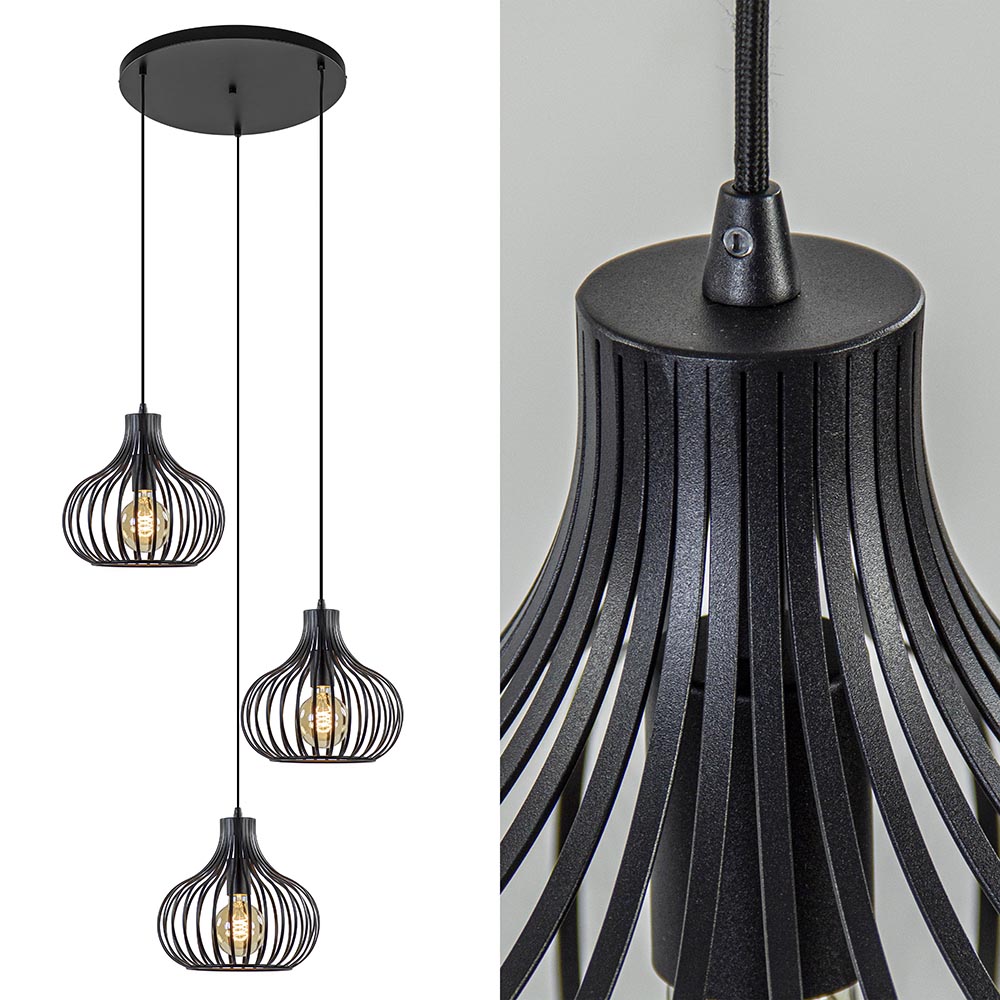 / Lampen / Draadlampen / 3-Lichts ronde hanglamp met zwarte draadkappen