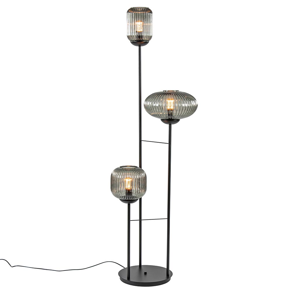 Een chique lamp met een retro twist. De vloerlamp bestaat uit een metalen armatuur dat is voorzien van een mat zwarte finish. Het armatuur heeft 3 niveaus waar de smoke glazen kappen op worden geplaatst. Zo ontstaat er een speelse verdeling in de lamp. De smoke glazen kappen benadrukken het chique effect mede door de donkere kleur, maar ook door het reliëf in het glas. De vloerlamp is voorzien van een zwart snoer met een lengte van 320 cm. De schakelaar bevindt zich op 170 cm in het snoer. De staande lamp wordt geleverd exclusief lichtbron.