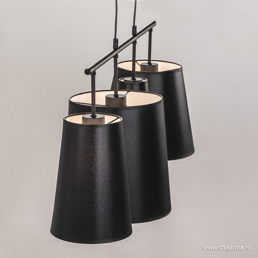 Wat een sfeermaker is dit. Super leuk voor boven de eettafel. De hanglamp is voorzien van 4 diverse stoffen kappen die samen 1 geheel vormen. De kappen zitten bevestigd op een metalen armatuur die is afgewerkt met een mat zwarte finish. De kappen geven de hanglamp een speels effect en u kunt er zelf voor kiezen in welke volgorde u de kappen plaatst. Zo maakt u de lamp een klein beetje eigen. Het metalen armatuur hangt aan twee zwarte snoeren die naar wens zijn in te korten en de hanglamp wordt aan het plafond bevestigd met een kleine zwarte balk van 30 cm. De 4-lichts hanglamp met zwarte kappen wordt geleverd zonder lichtbronnen (4x E27).