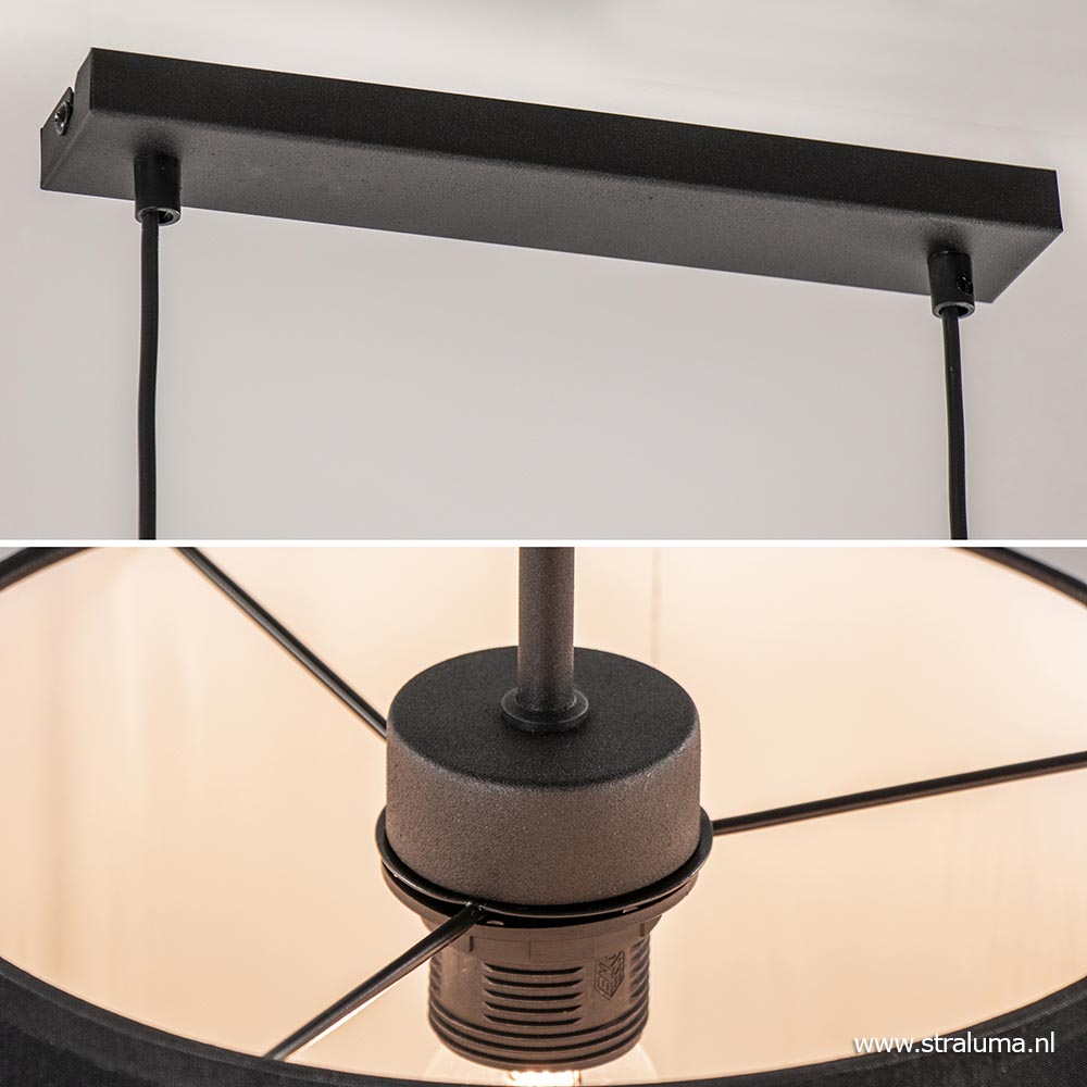 – hoogte: 175 cm (verstelbaar) – kap: 100x30x45 cm – bevestiging: 30x5x2 cm – diverse stoffen kappen, zwart – metaal, mat zwart – exclusief lichtbron (4x E27)
