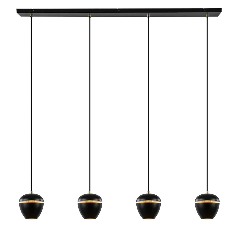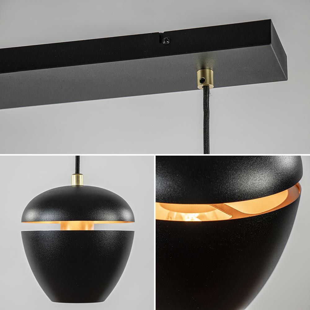 – Afmetingen: 120 x 15 x 200 cm – Plafondbevestiging: 120 x 10 x 2.5 cm – Kap: Ø15 x 15 cm – Metaal, mat zwart en goud – Exclusief lichtbron (4 x E27) – Dimbaar (exclusief)
