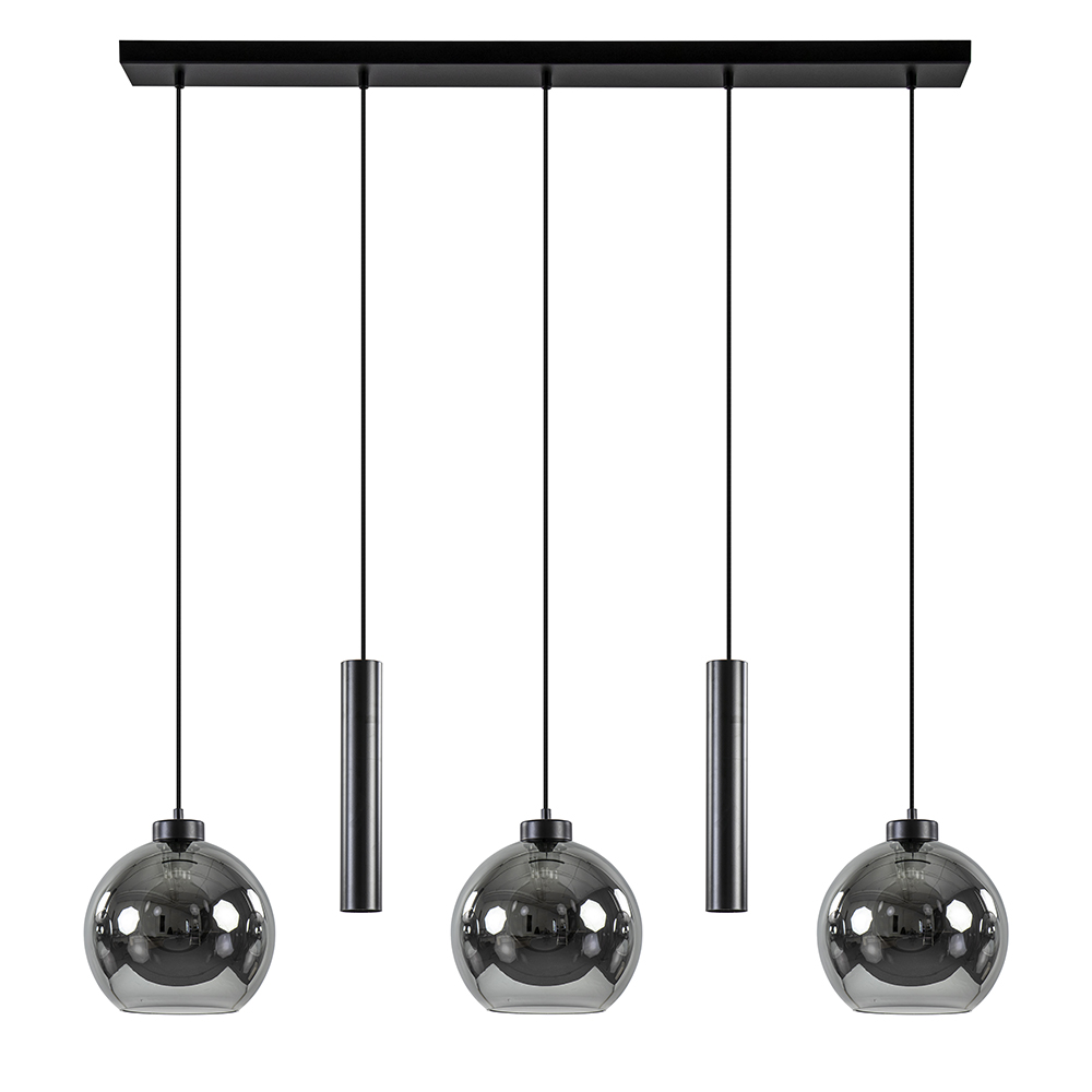 – afm: 120x25x120 cm – bevestiging: 110x8x3 cm – kappen: Ø25 cm – cilinders: Ø5,5×33 cm – smoke glas – metaal, zwart – in hoogte verstelbaar – dimbaar (exclusief) – exclusief lichtbron (3x E27 + 2x GU10)