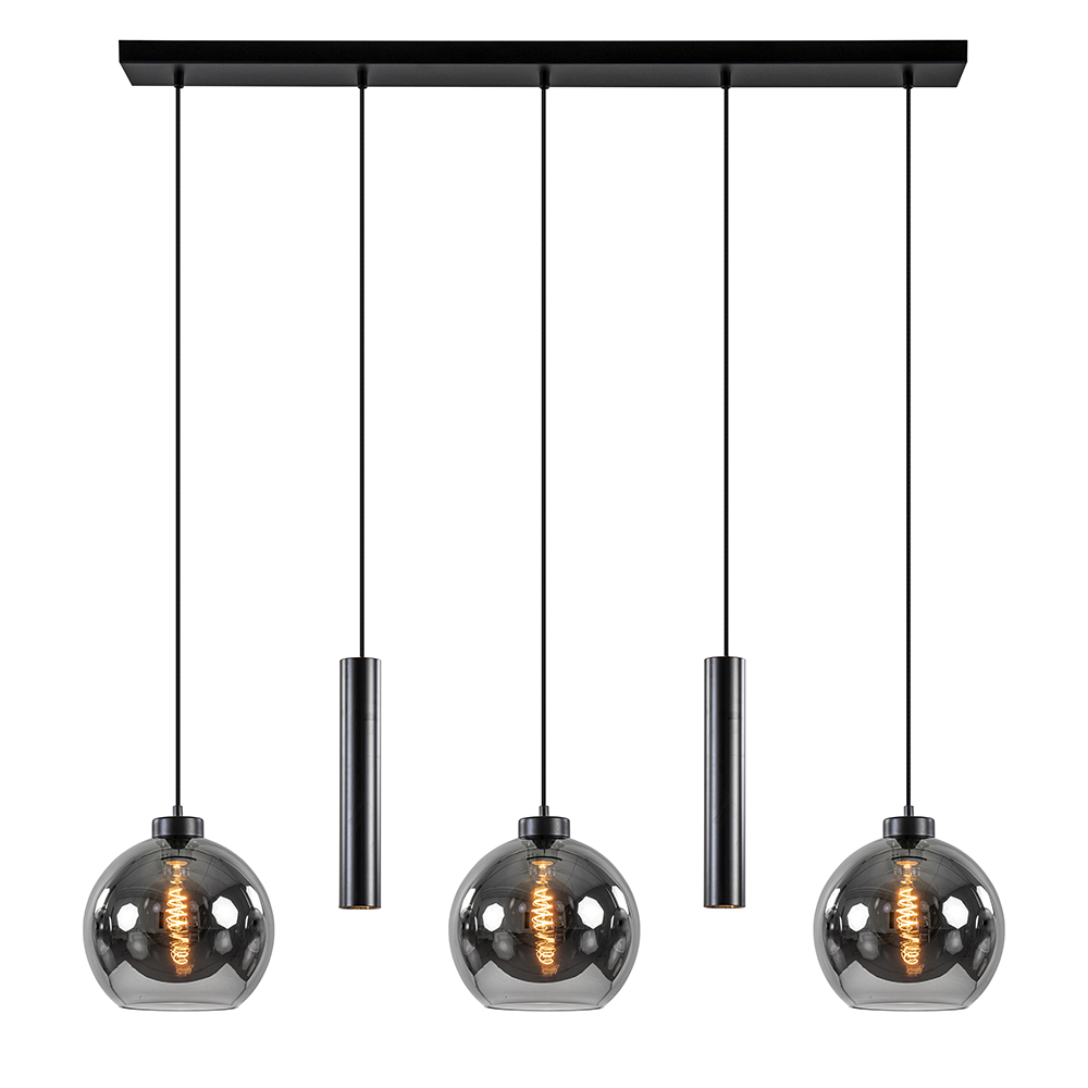 Deze 5-lichts eettafelhanglamp brengt sfeer en functie samen. De drie smoke glazen bollen zorgen voor diffuus licht in de ruimte en zo voor een fijne sfeer en een luxe uitstraling. De twee cilinders geven weer functioneel licht door het oppervlak onder de lamp goed uit te lichten. Ideaal dus voor boven een eettafel, kookeiland of bar. De hanglamp heeft een hoogte van 120 cm en is naar wens in te korten. De eettafelhanglamp is dimbaar middels een externe dimmer en wordt geleverd exclusief lichtbronnen.
