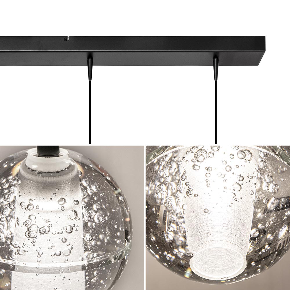 Een moderne hanglamp met een hoogwaardige kwaliteit glas. De glazen bollen zijn voorzien van een bubbel effect wat leuk oplicht wanneer de lamp wordt ingeschakeld. Binnenin de bol is het glas mat zodat er niet direct in de lichtbron kan worden gekeken. Dit is een LED lichtpunt die met 450 lumen per bol een flinke opbrengst geeft. Door middel van een externe dimmer (exclusief) zou de lamp gedimt kunnen worden. De helder glazen bollen hangen aan zwarte snoeren welke naar wens zijn in te korten. De maximale hoogte van de lamp is 135 cm. De moderne eettafelhanglamp is een fijne sfeermaker met een mooi effect.
