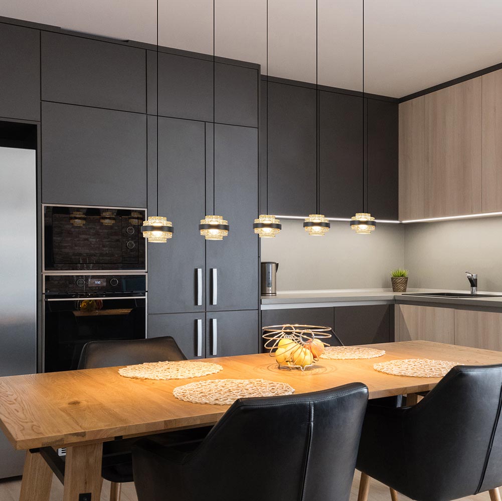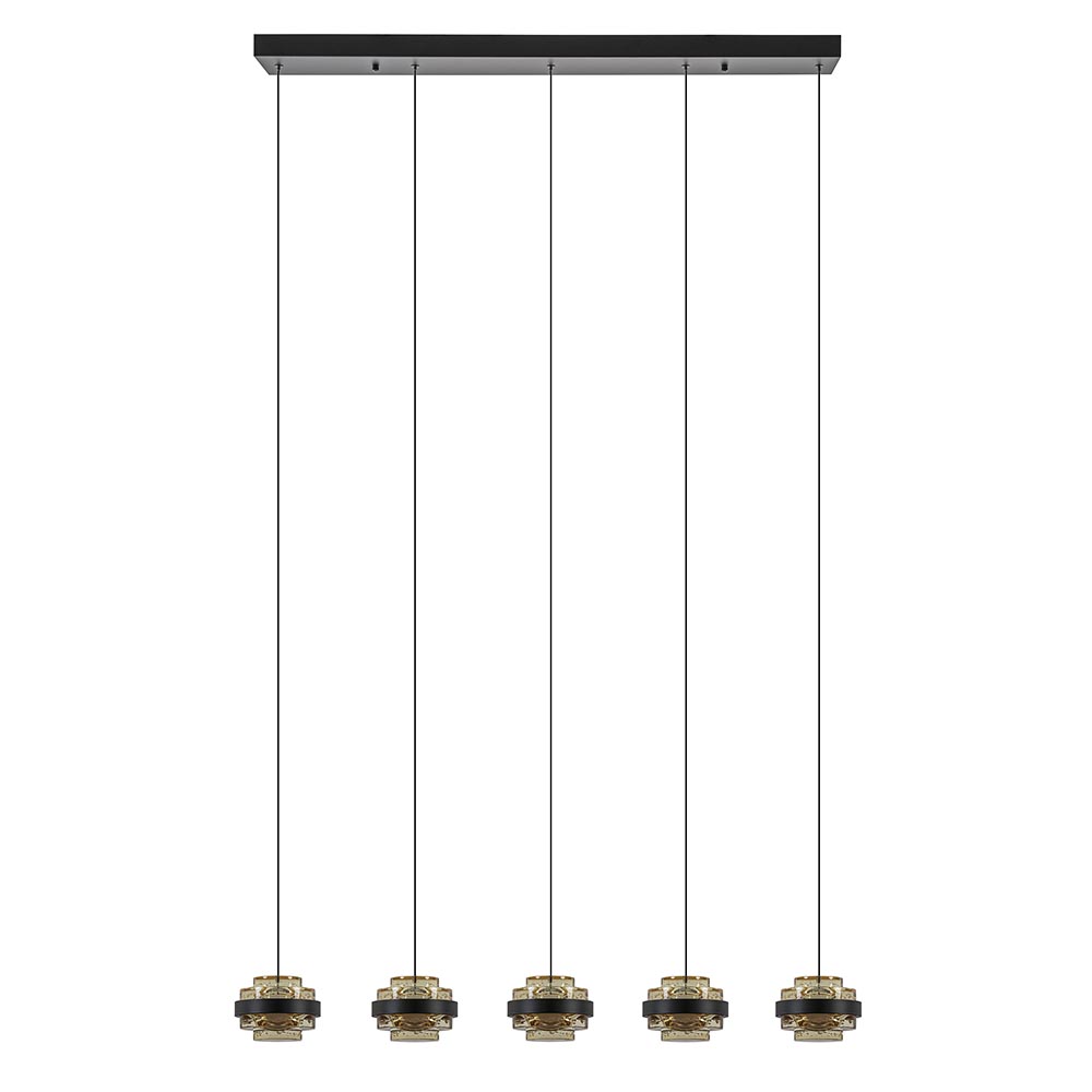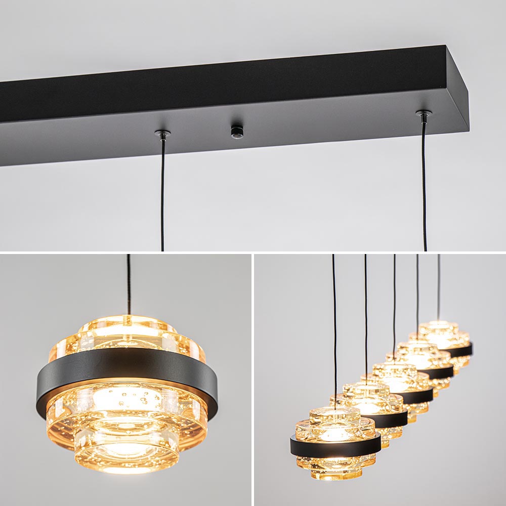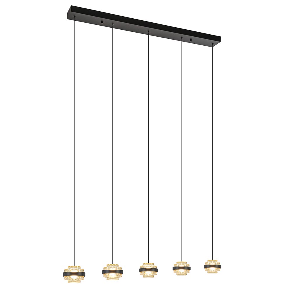 Een sfeervolle toevoeging voor boven de eettafel of bar. De kappen hebben een aparte vorm en zijn voorzien van LED verlichting. De kappen zijn deels van massief glas en deels mat zwart metaal. Dit geeft de lamp een luxe uitstraling. Het glas is voorzien van luchtbelletjes wat de hanglamp een speels effect geeft. De hanglamp is gemakkelijk in hoogte aan te passen. Hang de kappen op één lijn voor een strak geheel, of laat ze verspringen om het speels te maken. De 5-lichts eettafelhanglamp is dimbaar middels een externe LED dimmer (exclusief).