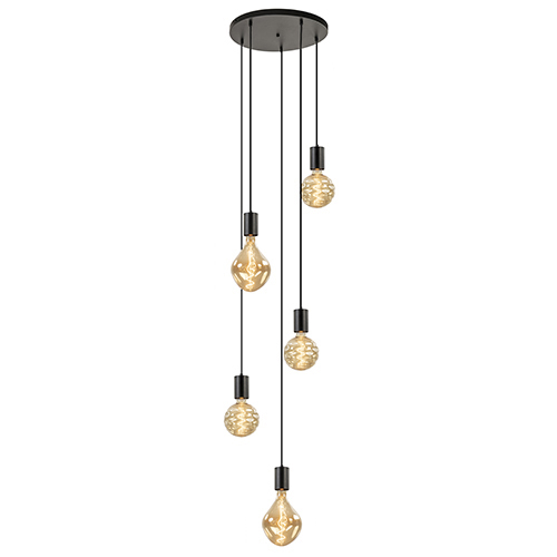 Een grote trend in de verlichting zijn de XXL lichtbronnen. Deze zorgen ervoor dat een kap niet meer nodig is maar dat de bron zelf als kap dient. De 5-lichts hanglamp is perfect geschikt voor dit soort lichtbronnen. De pendels zijn net even een slag groter dan normaal waardoor de verhouding met de lichtbron beter klopt. De pendels zijn naar wens op hoogte te hangen met een maximale hoogte van 415 cm. Dit maakt de pendel hanglamp zeer geschikt als vide lamp of voor een ruimte met een hoog plafond. De zwarte hanglamp wordt aan het plafond bevestigd met een ronde plaat van 44 cm doorsnede.