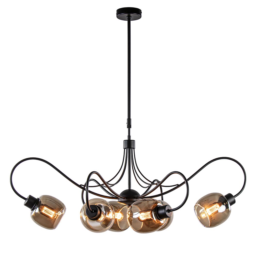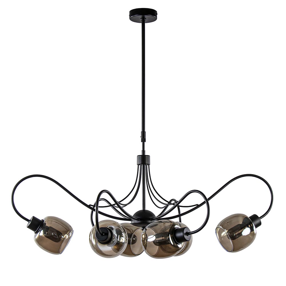 Een stijlvolle hanglamp met een sierlijk design. De hanglamp heeft een metalen armatuur dat is uitgevoerd in het mat zwart. De sierlijke armen geven de lamp een klassieke uitstraling. Het zwarte armatuur is mooi gecombineerd met smoke glas wat de lamp weer een trendy en chique look geeft. De hanglamp is in hoogte te verstellen met een minimale hoogte van 90 cm en een maximale hoogte van 125 cm. Ideaal voor boven een eettafel. De 6-lichts hanglamp met smoke glas wordt geleverd exclusief lichtbronnen en is dimbaar middels een externe dimmer (exclusief).