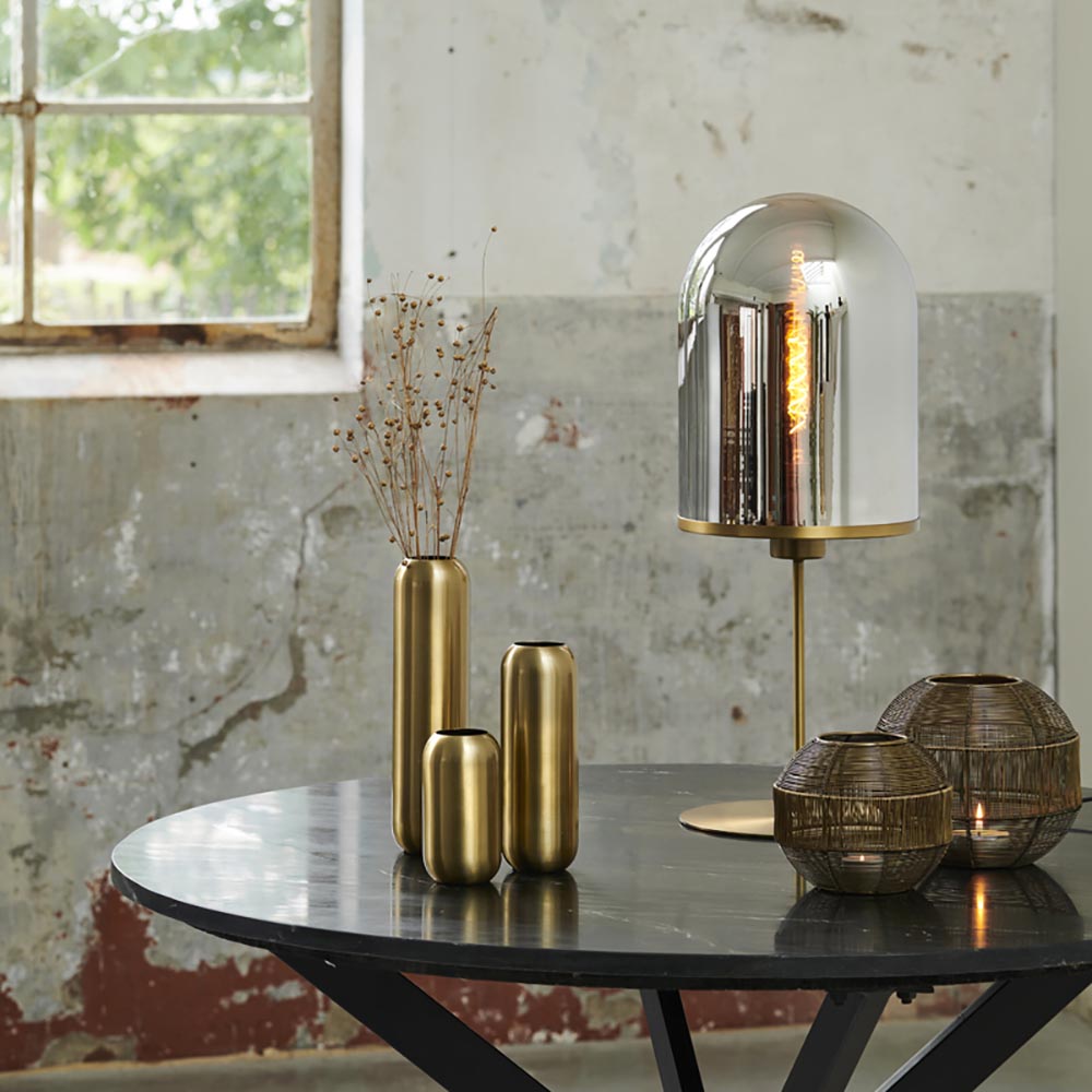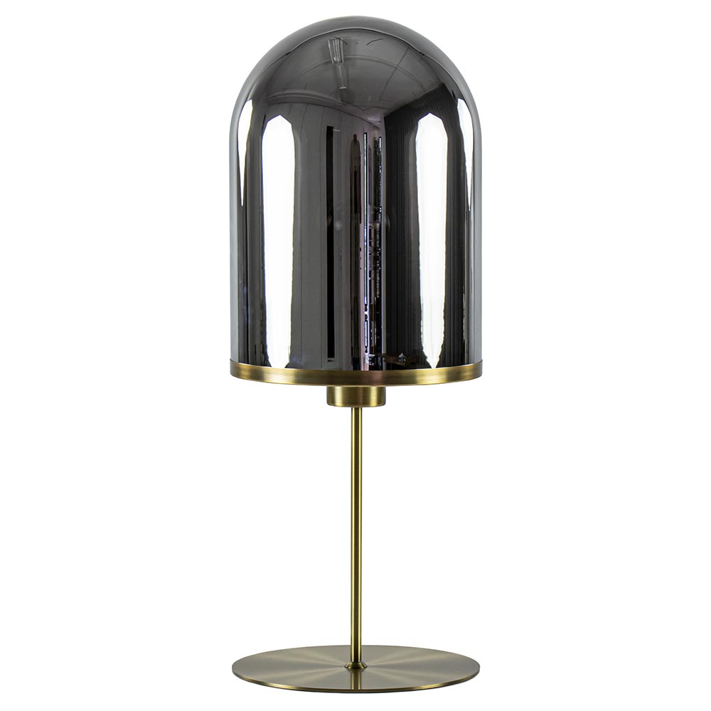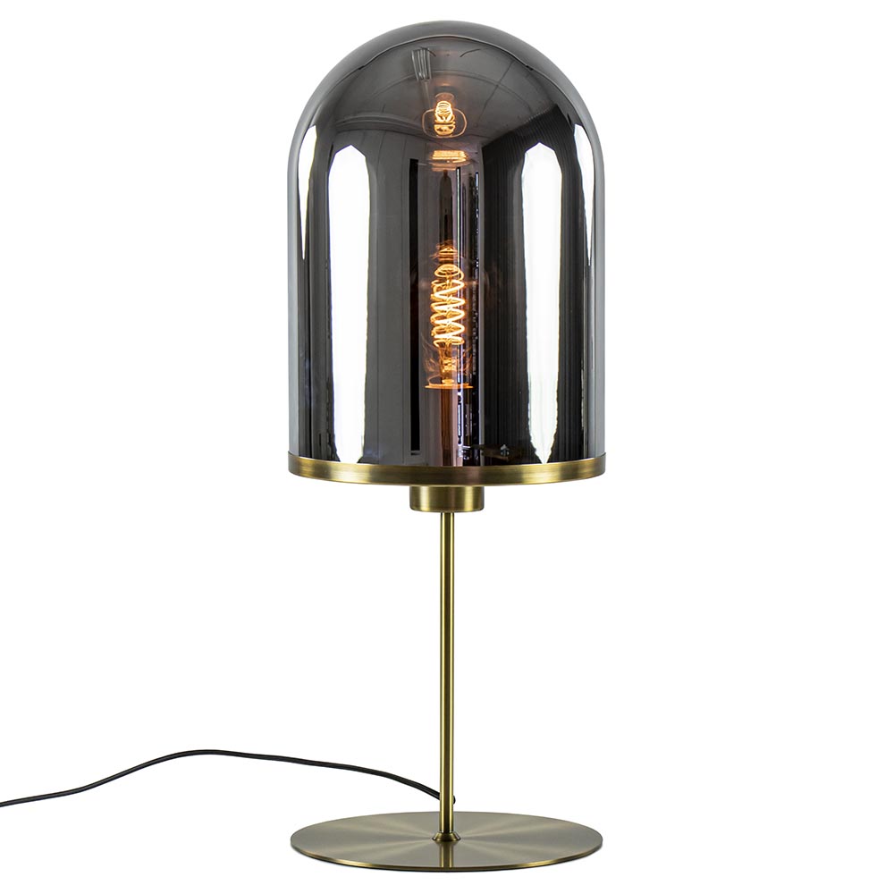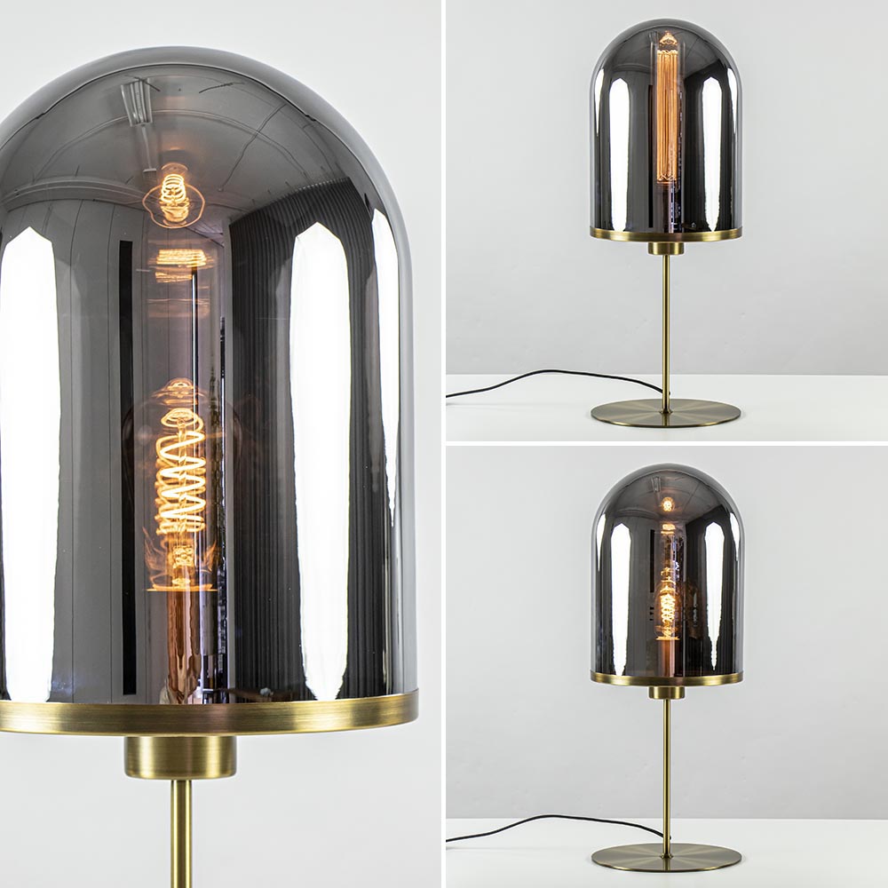 Modern met een luxe uitstraling. Deze metalen bronskleurige tafellamp is voorzien van een smoke glazen stolp met een spiegelend effect. Zodra de lamp is uitgeschakeld spiegeld het glas z’n omgeving, schakelt u de lamp in, dan wordt het glas smoke, oftewel donker transparant. Dit effect zorgt voor de luxe uitstraling van de lamp en wordt versterkt door de vorm van het glas. Het smokey glas wordt ondersteund door een bronzen metalen voet. De zwarte tafellamp is voorzien van een zwart snoer van 180 cm, de schakelaar bevindt zich op 40 cm van het armatuur. Let op, de tafellamp wordt geleverd zonder lichtbron (E27).