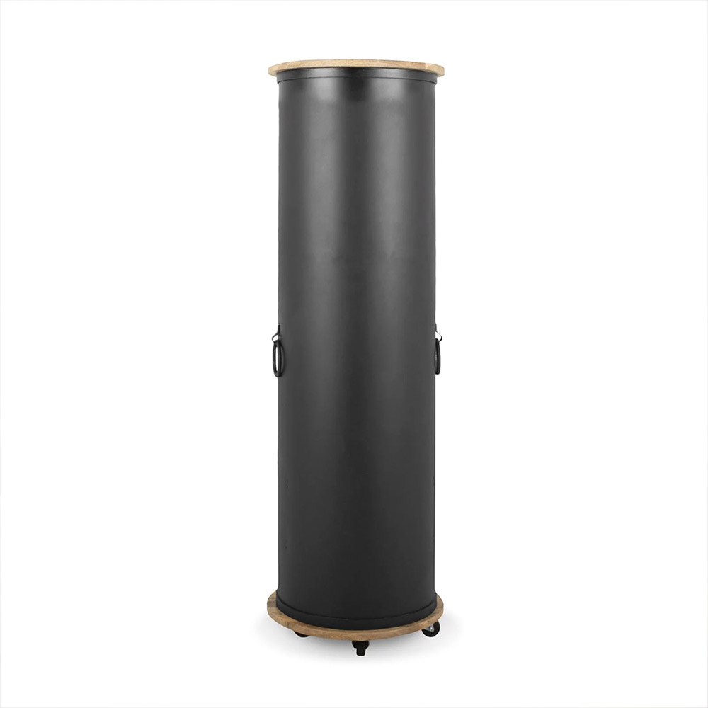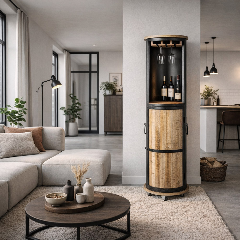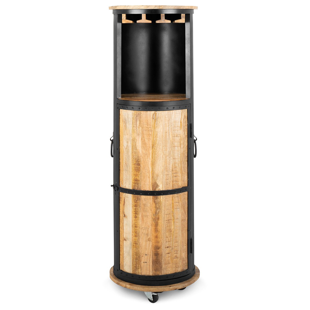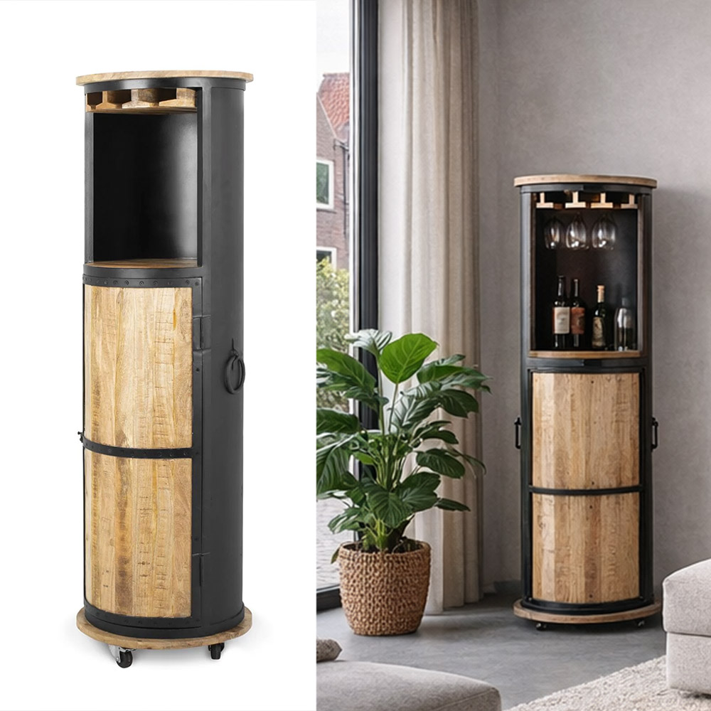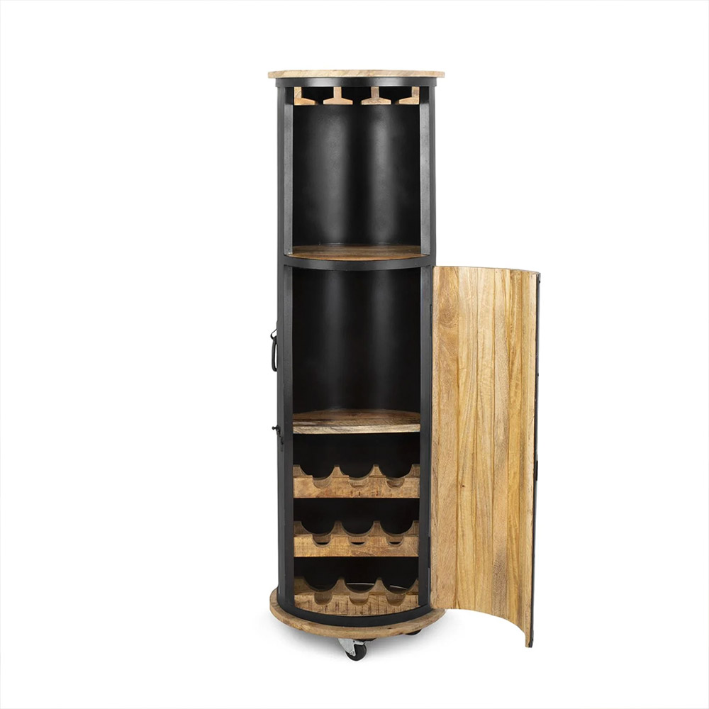 • Industriële wijnkast met ronde vorm en karaktervolle uitstraling • Gemaakt van mangohout met stevig stalen frame • Ruimte voor wijnflessen en hangplek voor wijnglazen • Compact formaat – ideaal voor woonkamer, eetkamer of keuken • Stoere combinatie van zwart staal en warm hout