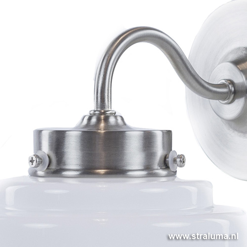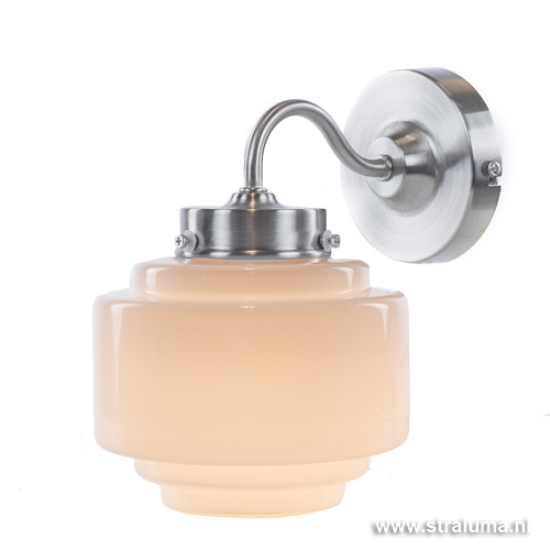Een super schattig wandlampje in Art Deco stijl. De foto geeft de indruk dat hij vrij groot is, maar in het echt heeft het glas maar een doorsnede van 15 cm. Het armatuur is uitgevoerd in geschuurd staal en gecombineerd met een mooi afgewerkt opaal glas. Het glas op deze klassieke wandlamp zorgt ervoor dat het licht mooi diffuus verspreid wordt. Niet alleen een aanwinst in een klassiek interieur, maar ook prachtig in een romantisch interieur. Mooi in de hal, woonkamer of naast het bed voor een toegevoegde Art Deco touch.