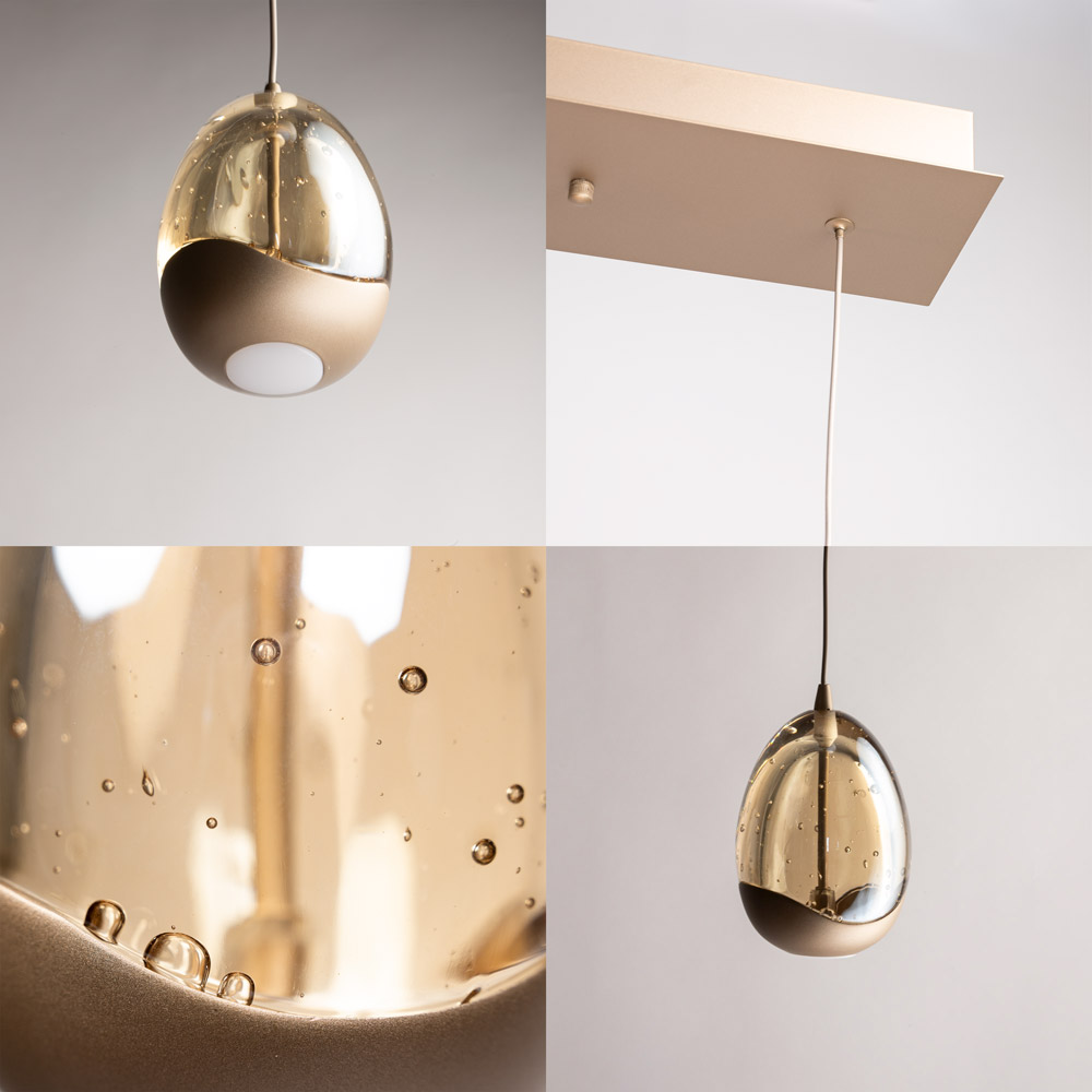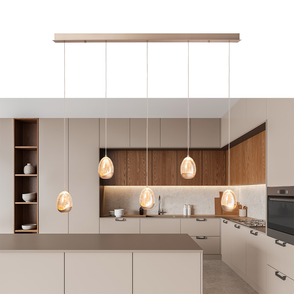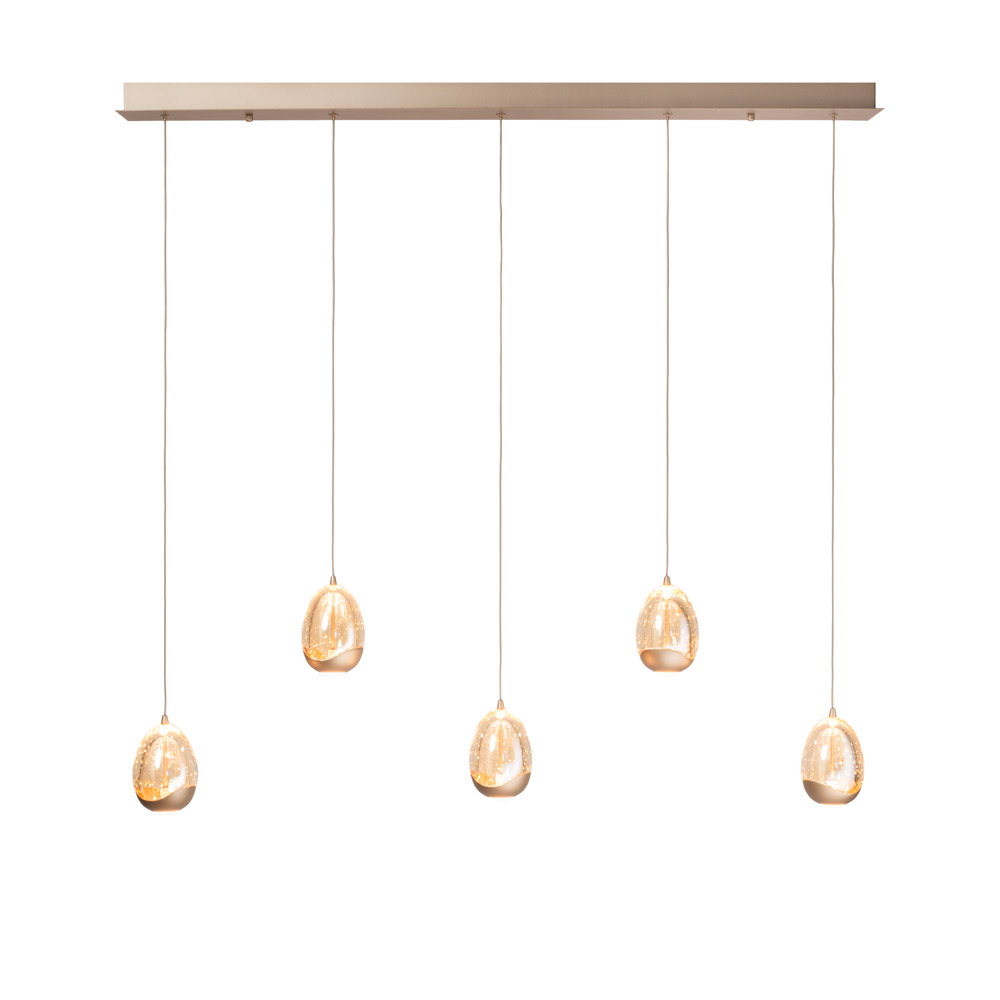 Highlights • Moderne hanglamp met 5 glazen ‘egg’ lichtpunten op een strakke balk • Warme champagnekleur (beige tint) voor een rustige, luxe uitstraling • Functioneel licht naar beneden en sfeervol licht rondom • Ideaal boven een eettafel of kookeiland van ca. 160–220 cm • Individueel verstelbare snoeren voor speels en persoonlijk effect • Uniek luchtbelglas voor een sprankelend lichtbeeld • Dimbaar via externe dimmer