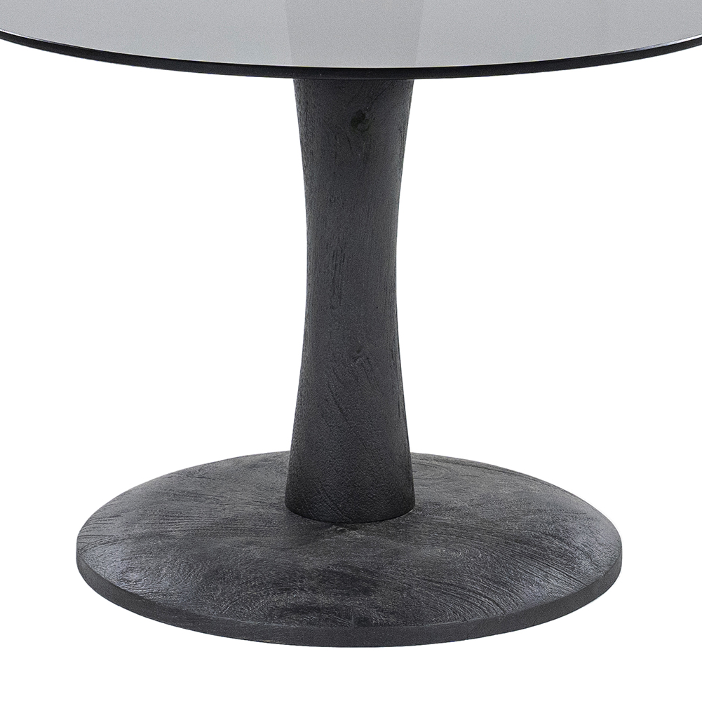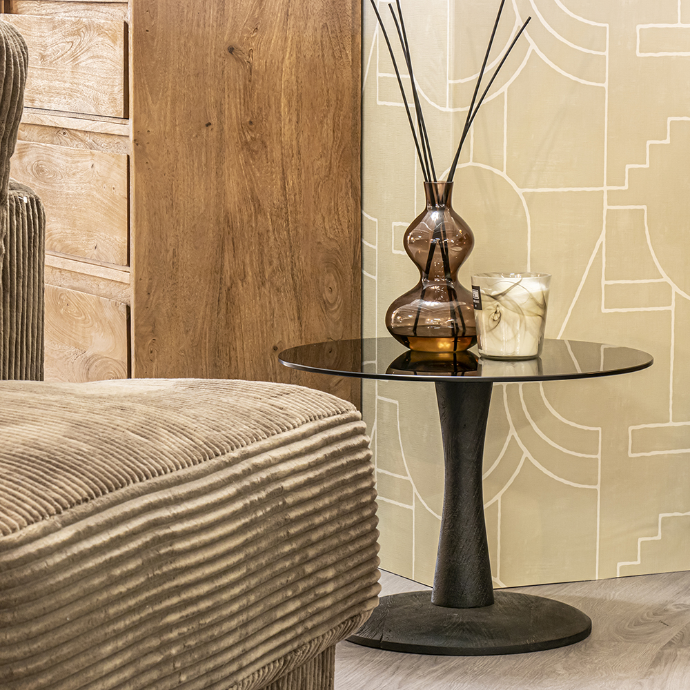 Belangrijkste kenmerken • Afmetingen: Ø55 × 50 cm (h) • Kleur: Zwart onderstel met getint zwart glas • Materiaal blad: Getint veiligheidsglas • Materiaal onderstel: Mangohout, zwart gelakt • Vorm: Rond • Montage: Eenvoudige montage vereist • Onderhoud: Glas met zachte doek reinigen; hout afnemen met een droge doek • Stijl: Modern • Chic • Minimalistisch