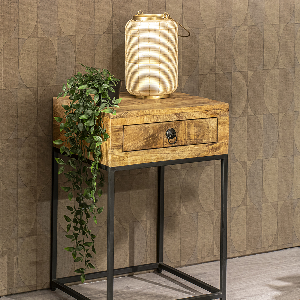 Mooie warme bijzettafel. De bijzettafel is een echte eyecatcher. De tafel bestaat uit mangohout met een mat zwart metalen frame. De tafel heeft een la met een mat zwart metalen handgreep. Het hout is behandeld en beschermd. Het is af te nemen met een vochtig doekje. De bijzettafel is ook te gebruiken als een nachtkastje.