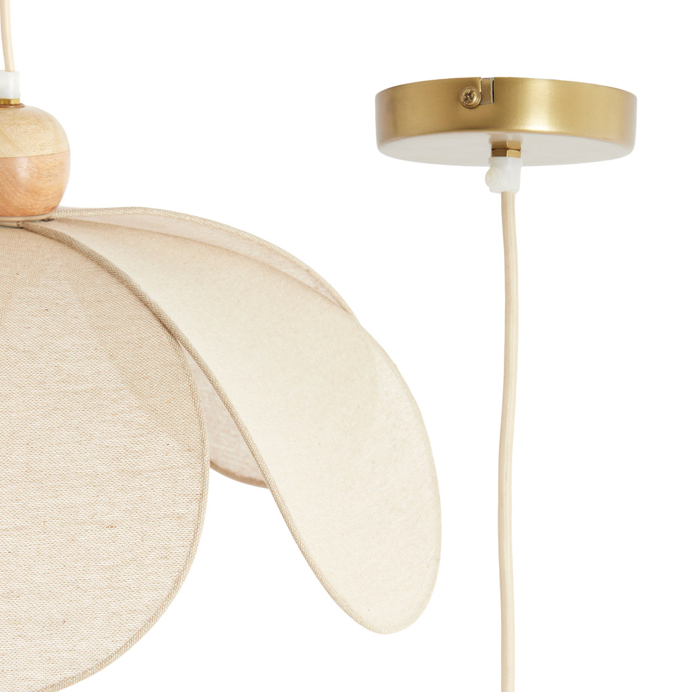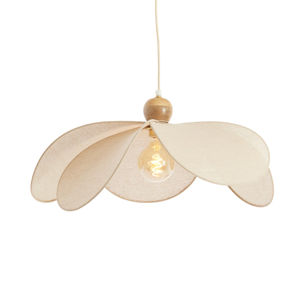 • Verkrijgbaar in twee maten (Ø50 en Ø60 cm) • Organisch design met overlappende stoffen bladen • Warme combinatie van hout en stof • Geschikt voor 1× E27 lichtbron (excl.) • Perfect boven een ronde eettafel van 120–160 cm