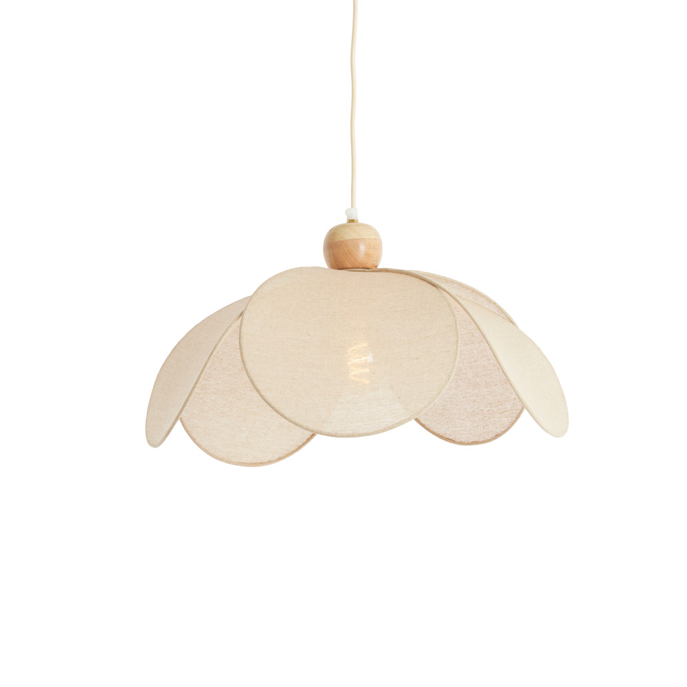 • Verkrijgbaar in twee maten (Ø50 en Ø60 cm) • Organisch design met overlappende stoffen bladen • Warme combinatie van hout en stof • Geschikt voor 1× E27 lichtbron (excl.) • Perfect boven een ronde eettafel van 120–160 cm