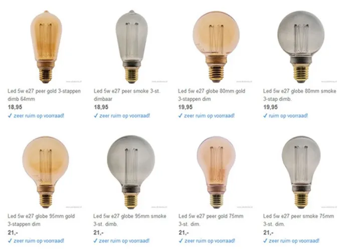 Voor een landelijk-, botanisch- of industrieel interieur hebben we de speciale warme vintage gold modellen. In het geval van een strak-, modern-, Scandinavisch- of design interieur dan zijn de grijze smoke lichtbronnen een perfecte optie.