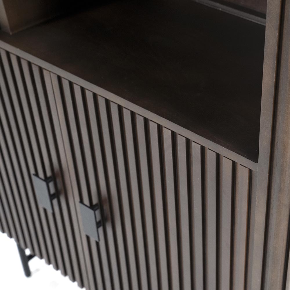 Deze boekenkast is gemaakt van een combinatie van mangohout met een metalen onderstel en metalen handgrepen. Deze kast heeft een unieke uitstraling door de verticale latjes. De boekenkast heeft een speels uiterlijk door de combinatie van open vakken en dichte deurtjes. Deze boekenkast komt in de kleuren bruin en zwart.