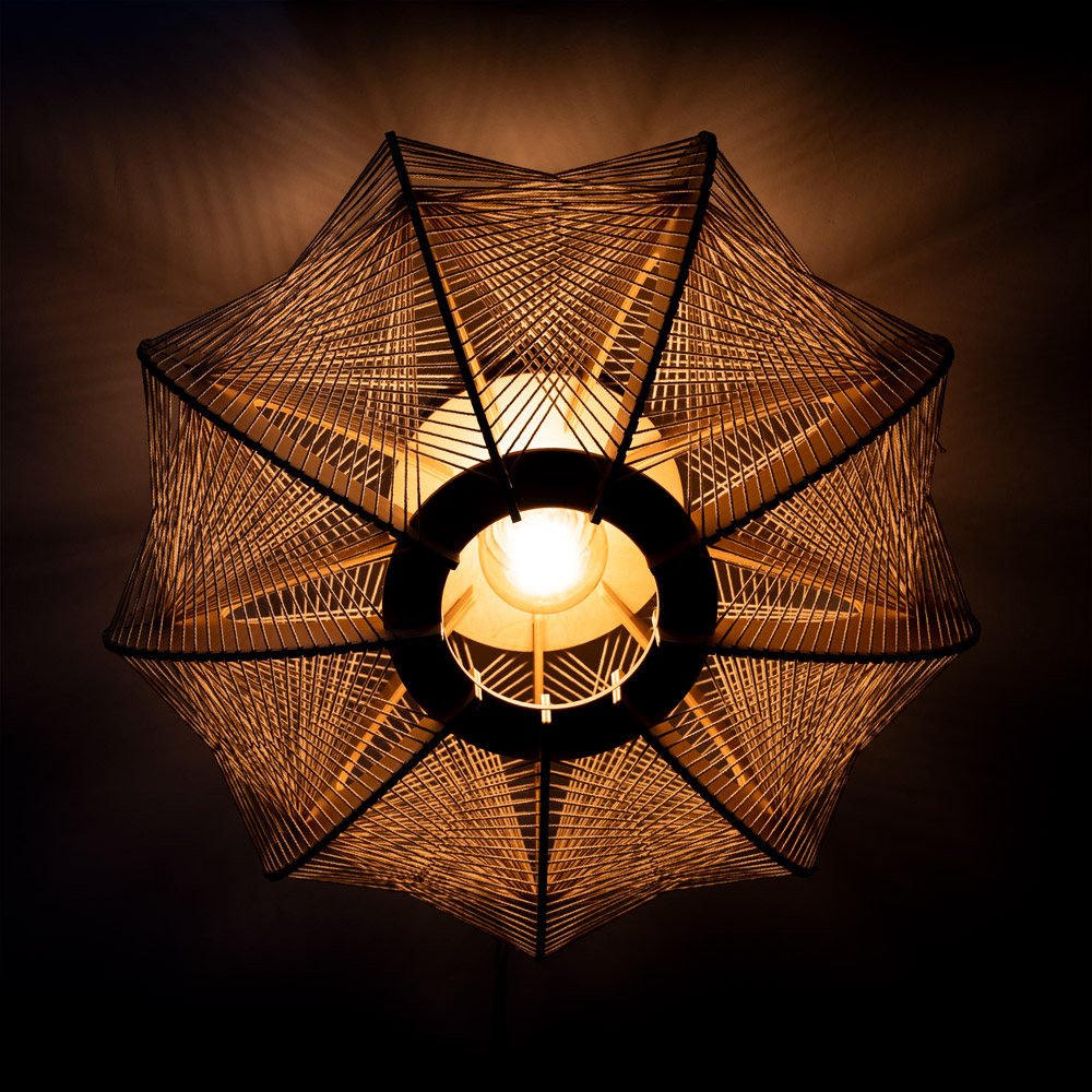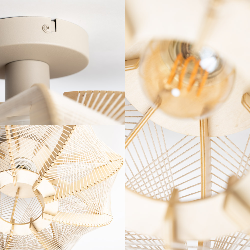De Jessica plafondlamp combineert hout en strak gespannen witte touwen tot een uniek geometrisch ontwerp. Het samenspel van de houten lamellen en de kruislings gespannen draden zorgt voor een luchtige uitstraling én een bijzonder lichteffect. Zodra het licht brandt, ontstaan er prachtige schaduwen op plafond en wanden — een echte blikvanger in de ruimte.