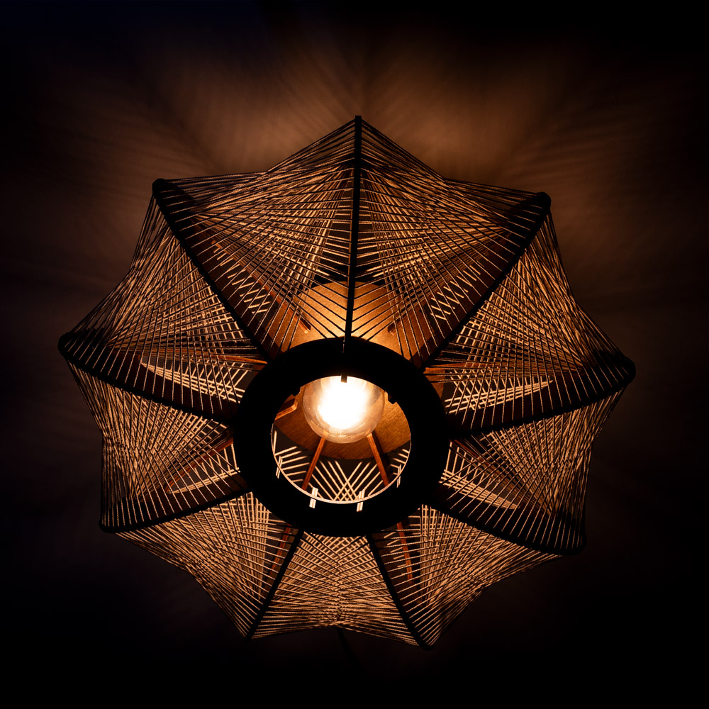 De Jessica plafondlamp combineert hout en strak gespannen witte touwen tot een uniek geometrisch ontwerp. Het samenspel van de houten lamellen en de kruislings gespannen draden zorgt voor een luchtige uitstraling én een bijzonder lichteffect. Zodra het licht brandt, ontstaan er prachtige schaduwen op plafond en wanden — een echte blikvanger in de ruimte.