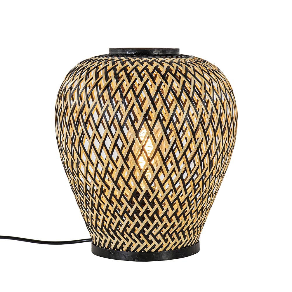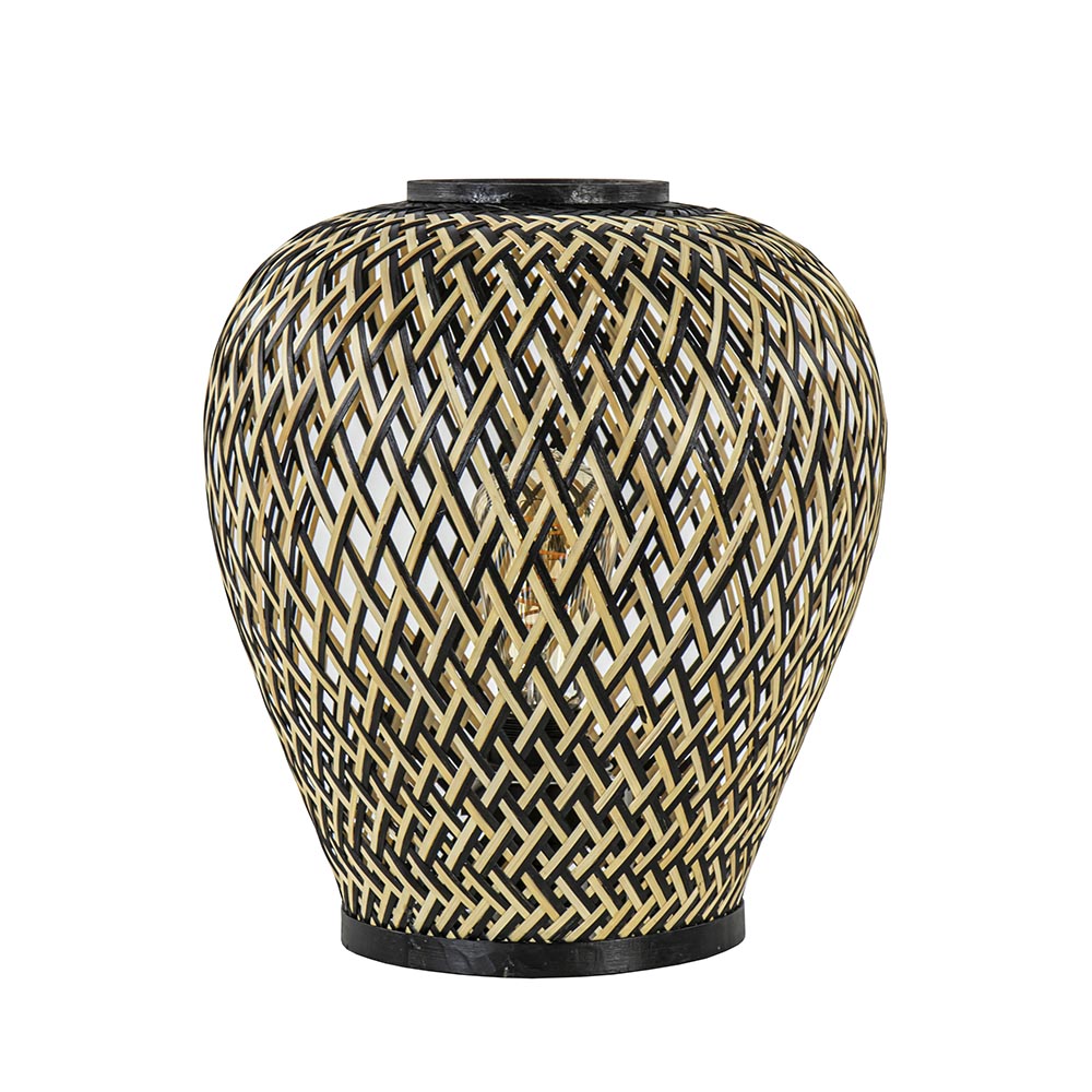 Ideaal voor een botanisch, Oosters of landelijk interieur. Deze tafellamp is volledig gemaakt van bamboe en uitgevoerd in het naturel met zwart. De tafellamp doet denken aan een vaas en heeft door de manier van vlechten een open structuur. De tafellamp is een sfeervolle toevoeging aan het interieur. De bamboe lamp is voorzien van een zwart snoer met een lengte van 180 cm. De schakelaar bevindt zich op 60 cm.