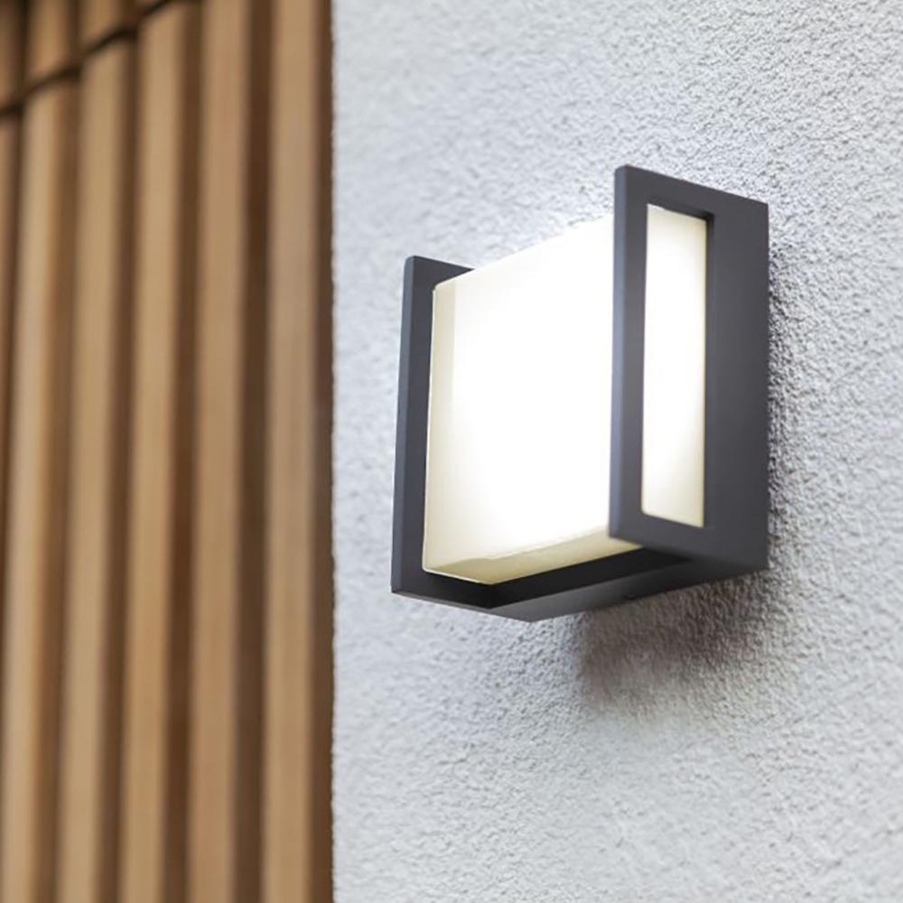 – afm: 14×7,2×14 CM – aluminium – donker grijs – geïntegreerd LED – 650 Lumen – 3000 Kelvin – IP54 goedgekeurd – weerbestendig van -20° tot +50°C