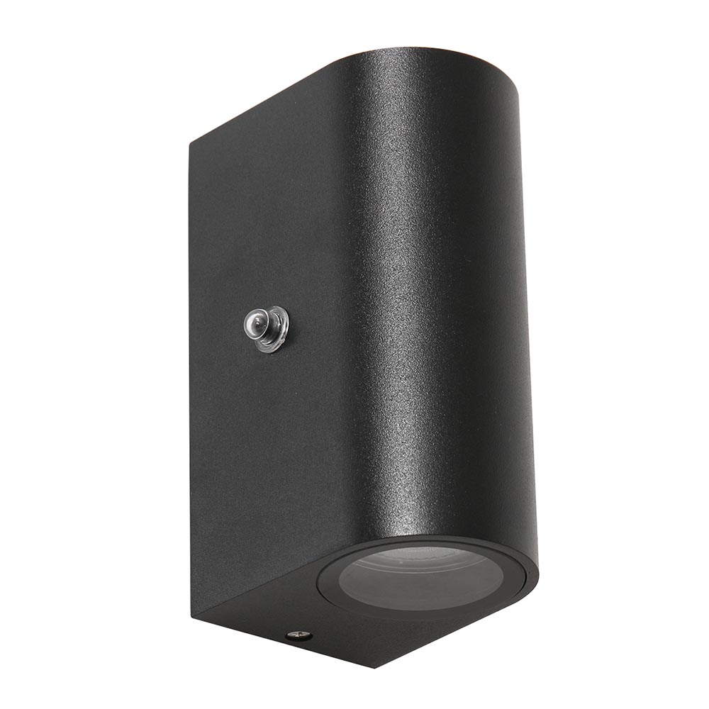 – afm: 6,7x9x15 cm – bevestiging: 6,7×15 cm – metaal – zwart – inclusief lichtbron (2x GU10 LED) – inclusief schemersensor – 2700 Kelvin – 345 lumen – energiezuinig | A+ – IP44 goedgekeurd