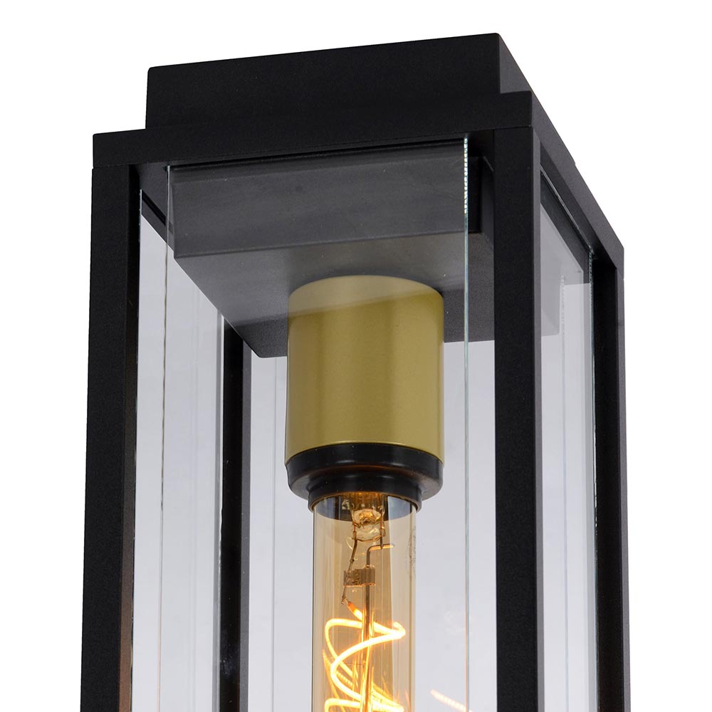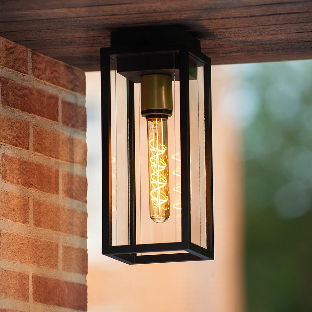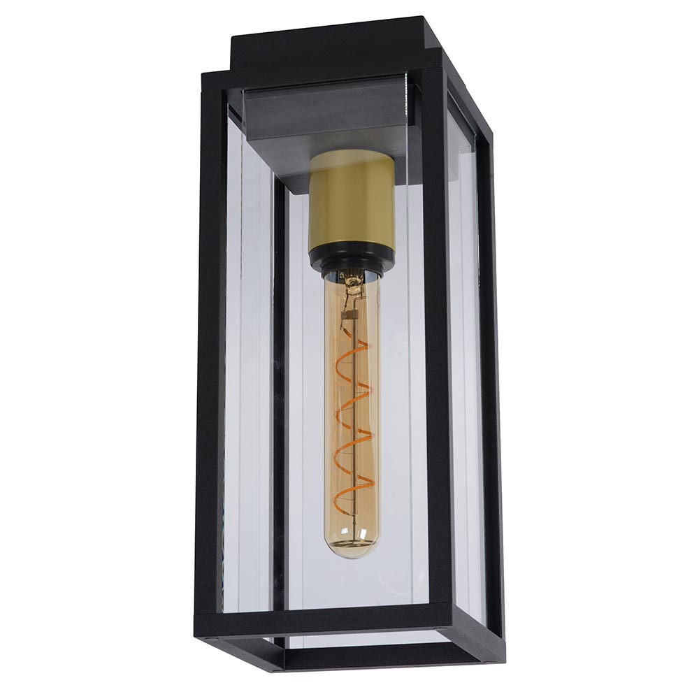 Met deze moderne buitenlamp bij de deur wordt thuiskomen een groot plezier. De buiten plafondlamp is gemaakt van metaal en uitgevoerd in het mat zwart. Leuk detail is de gouden fitting binnenin de lamp. De buitenlamp is verder afgewerkt met helder glas zodat deze goed is afgesloten. Hierdoor is de lamp IP54 goedgekeurd. De buitenlamp wordt geleverd exclusief lichtbron.