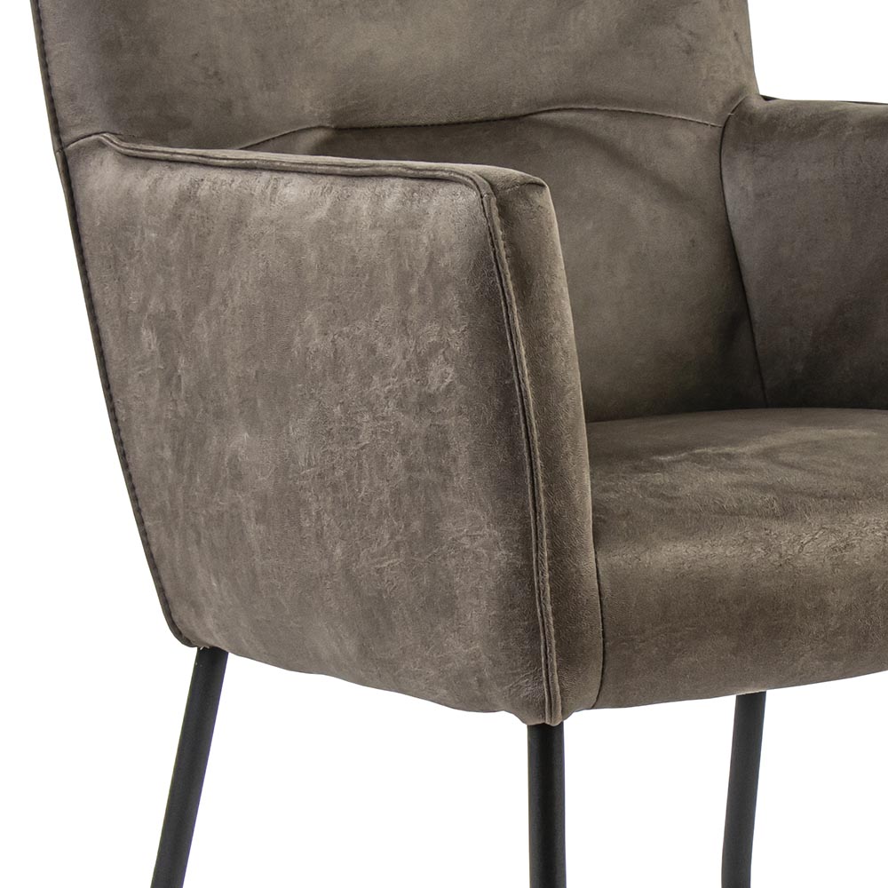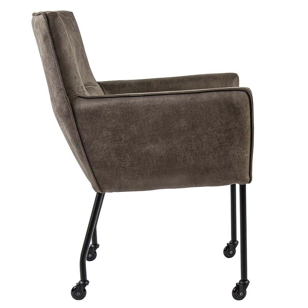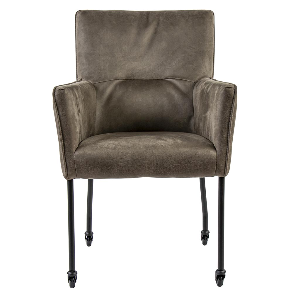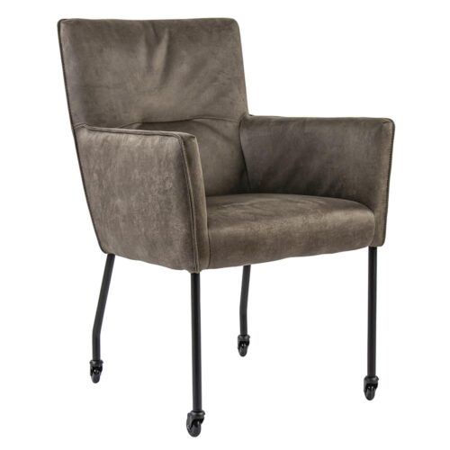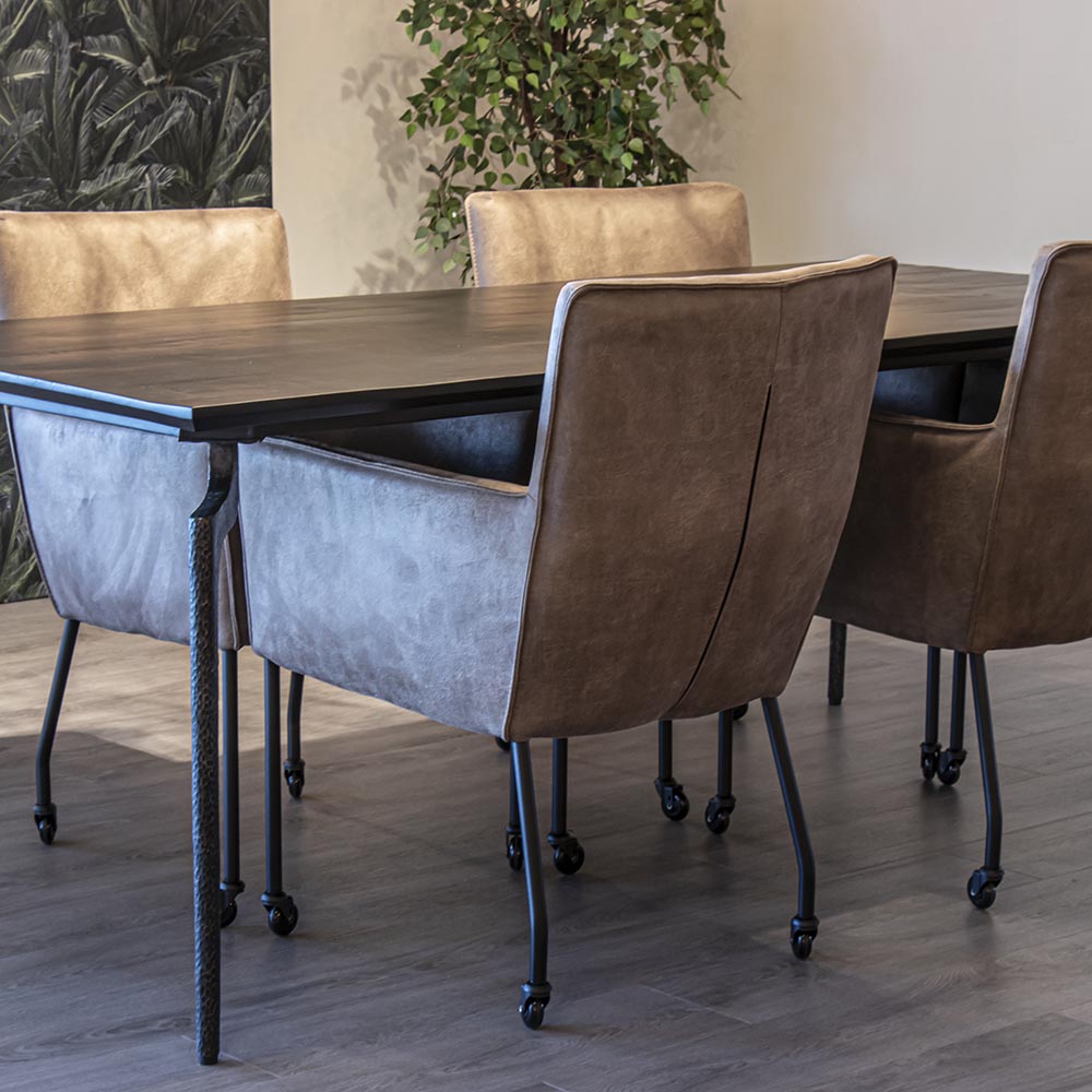 Een hele fijne eetkamerstoel om in te dineren, natafelen of zelfs te werken aan tafel. De armstoel is voorzien van wieltjes wat het aanschuiven gemakkelijk maakt. De zitting is volledig van bull leder en daardoor heel zacht. Bull leder, ook wel eco leer genoemd, is een combinatie van gerecycled buffelleer en polyester stof waardoor er een stevige kwaliteit ontstaat maar wel enorm zacht aanvoelt. Ook de armleuningen maken het natafelen nog fijner. Het bull leder is uitgevoerd in het liver en de slanke metalen pootjes in het zwart.