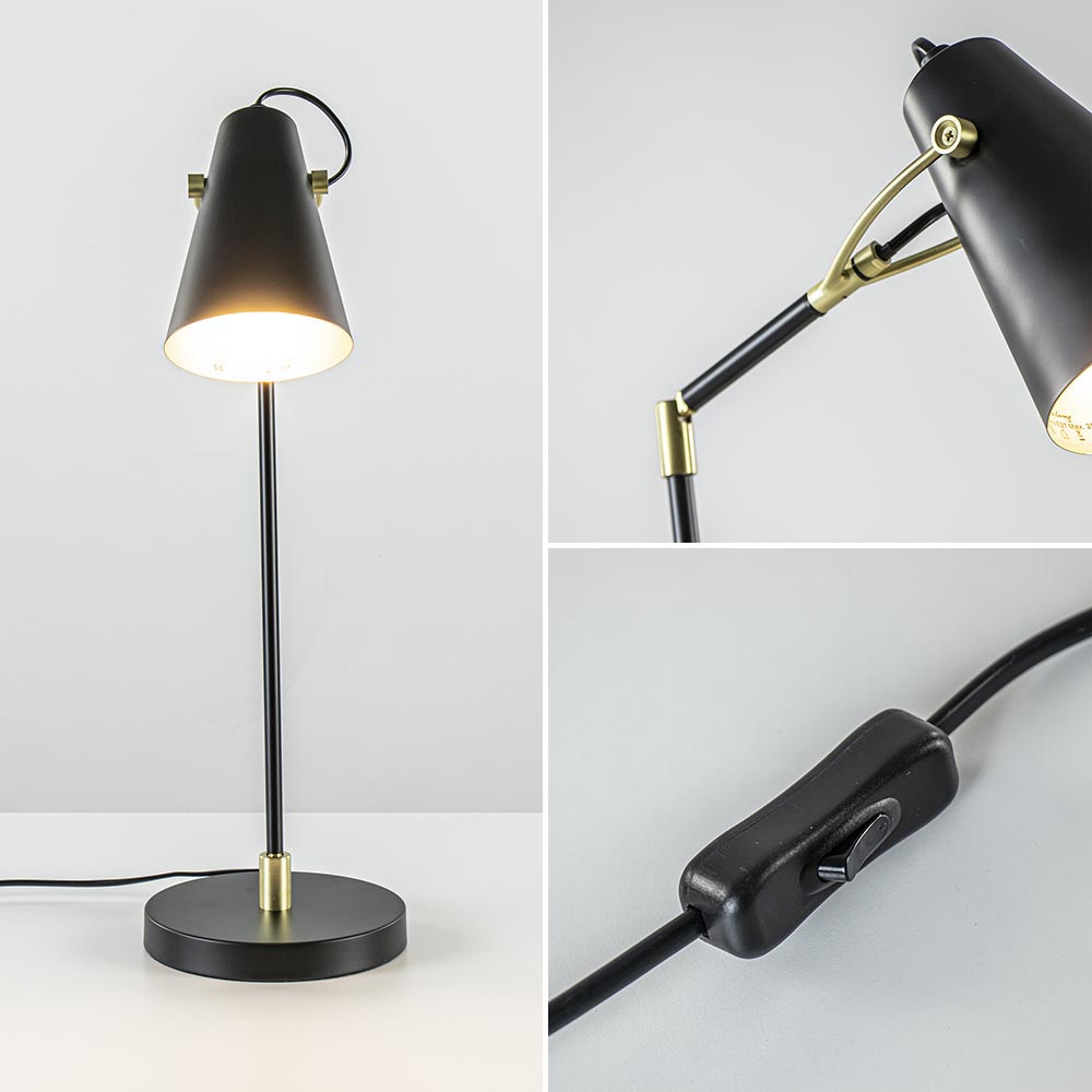 Dit kleine lampje is een ideale toevoeging aan uw bureau. De zwart met gouden bureaulamp Barre is op diverse plekken te verstellen. Zo kan de arm van het armatuur op twee plekken kantelen en kan de zwarte kap ook nog draaien. Zo kunt u de lamp altijd zo zetten dat hij het beste verlicht. Het snoer loopt netjes door het armatuur en heeft vanaf de voet nog een lengte van 170 cm, waarbij er een schakelaar op 40 cm van de voet zit. Bureaulamp Barre wordt geleverd zonder lichtbron (E27).