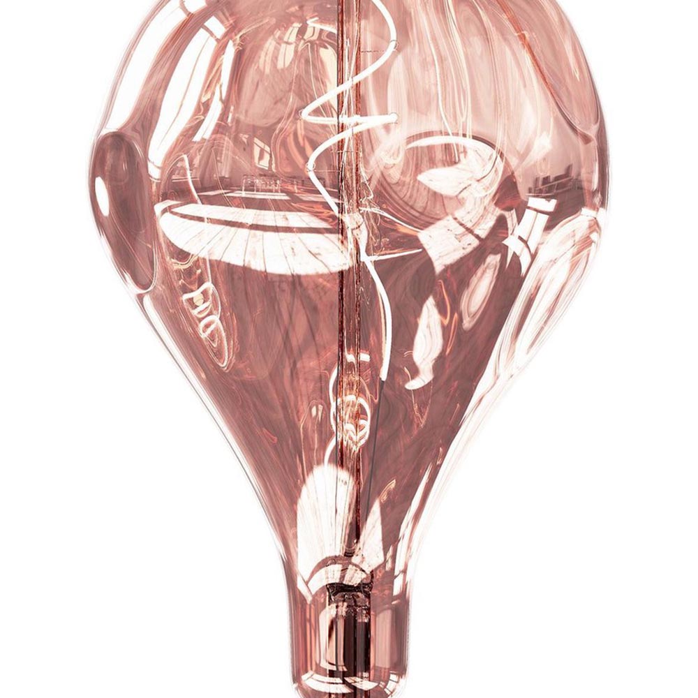 Een surrealistische versie van de klassieke gloeilamp. Deze druppelvormige bron met rosé glas komt uit de XXL serie en past super in de bijpassende E27 cord sets met de retro pendels. Het spiegelende glas geeft de lamp een luxe design uitstraling.