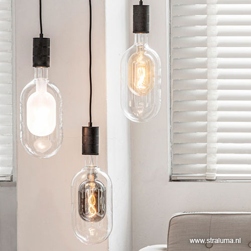 Het dubbele glas van deze lichtbron is moeilijk te maken. Het lamp-in-lamp effect is echter zeer de moeite waard. Het zorgt voor een mooie reflectie van het licht. Prachtig in een eenvoudige pendel, maar ook mooi in een grote groep. Deze design lichtbron geeft, ondanks het koele glas, mooi extra warm licht. Het buitenste glas is helder, het binnen glas heeft een diepe titanium glans.