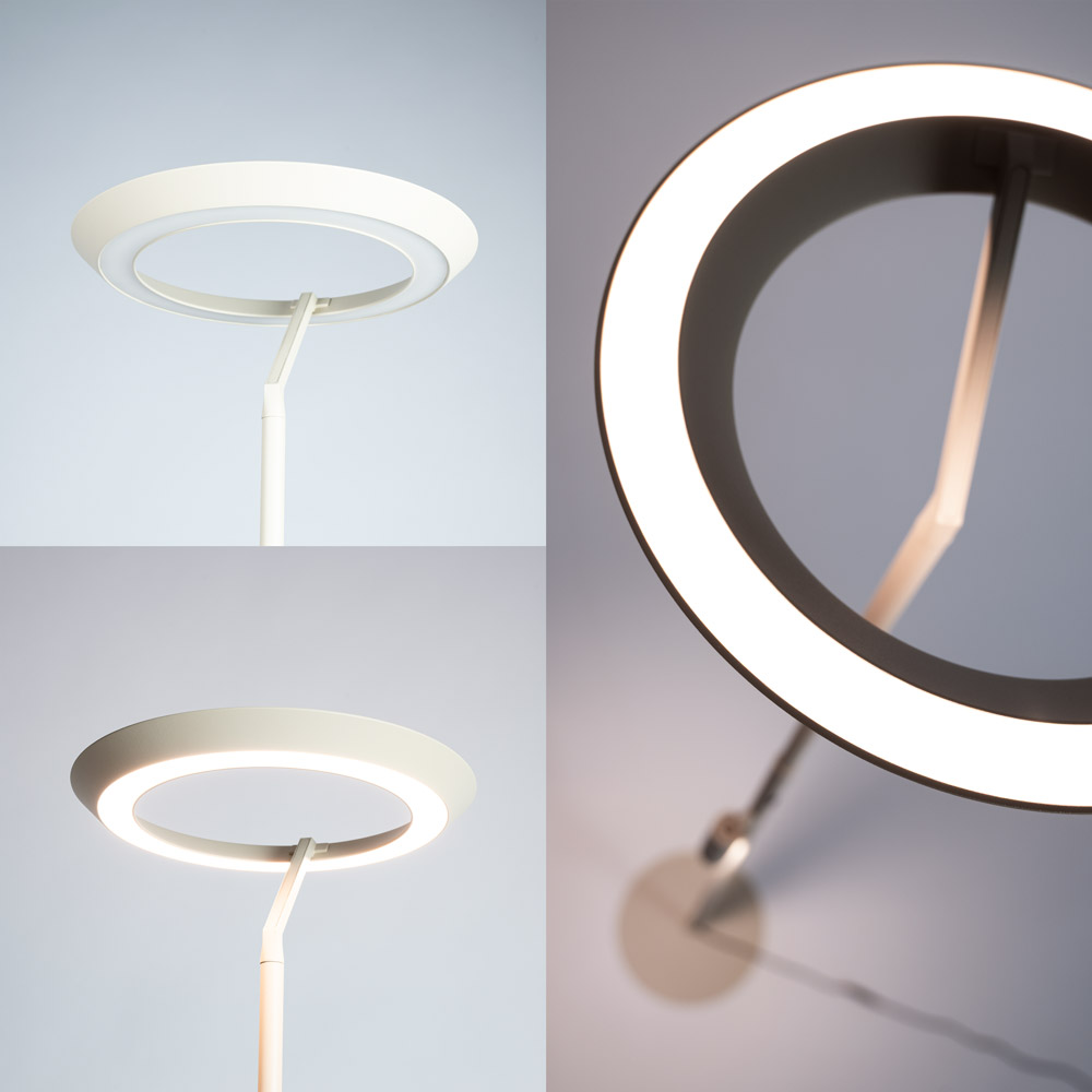 • Verkrijgbaar in twee stijlvolle kleuren: licht beige en zwart • Slanke vloerlamp met ronde metalen kap van Ø 28 cm • Geïntegreerde LED met warm wit licht van 2700K • Boven- en onderlicht zijn afzonderlijk te bedienen en te dimmen • Touchdimmer op de lamp voor eenvoudige bediening • Ideaal naast een fauteuil, bank of in een rustige leeshoek