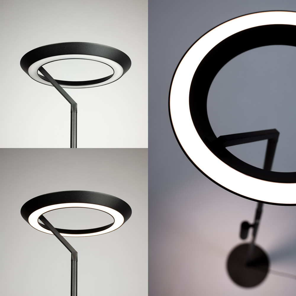 • Verkrijgbaar in twee stijlvolle kleuren: licht beige en zwart • Slanke vloerlamp met ronde metalen kap van Ø 28 cm • Geïntegreerde LED met warm wit licht van 2700K • Boven- en onderlicht zijn afzonderlijk te bedienen en te dimmen • Touchdimmer op de lamp voor eenvoudige bediening • Ideaal naast een fauteuil, bank of in een rustige leeshoek