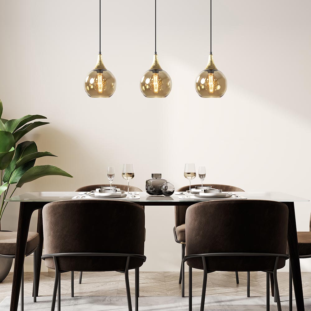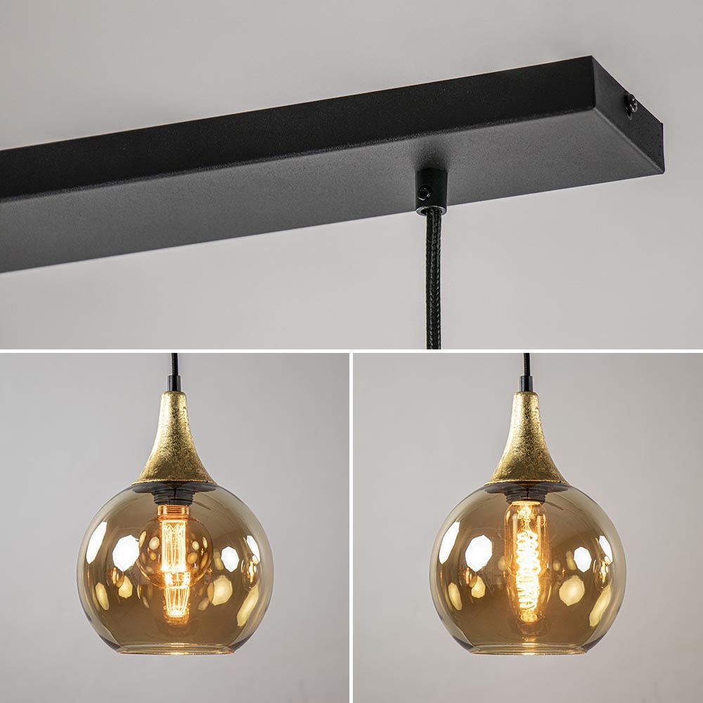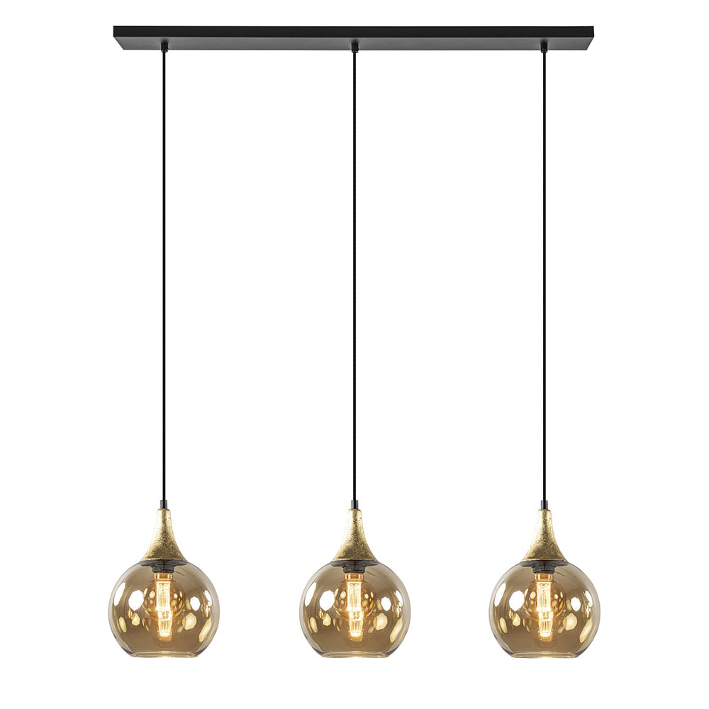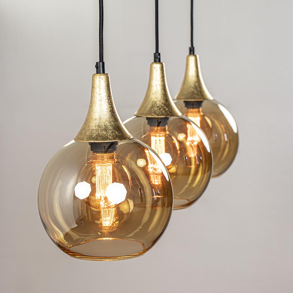 Deze prachtige 3-lichts hanglamp is een mooie toevoeging aan een chic of klassiek interieur. De hanglamp heeft een zwart armatuur en is voorzien van zwarte stof omwonden snoeren. Deze zijn naar wens in te korten, de maximale hoogte van de lamp is 150 cm. De 3 lichtpunten zijn afgewerkt met een pendel met bladgoud look die mooi is gecombineerd met amber glazen bollen. Deze hebben een doorsnede van 20 cm en zijn van onder open om gemakkelijk de lichtbron te plaatsen. De 3-lichts glazen hanglamp past perfect boven een eettafel vanaf 2 meter. De amber glazen hanglamp is dimbaar middels een externe dimmer (exclusief) en wordt geleverd exclusief lichtbron.