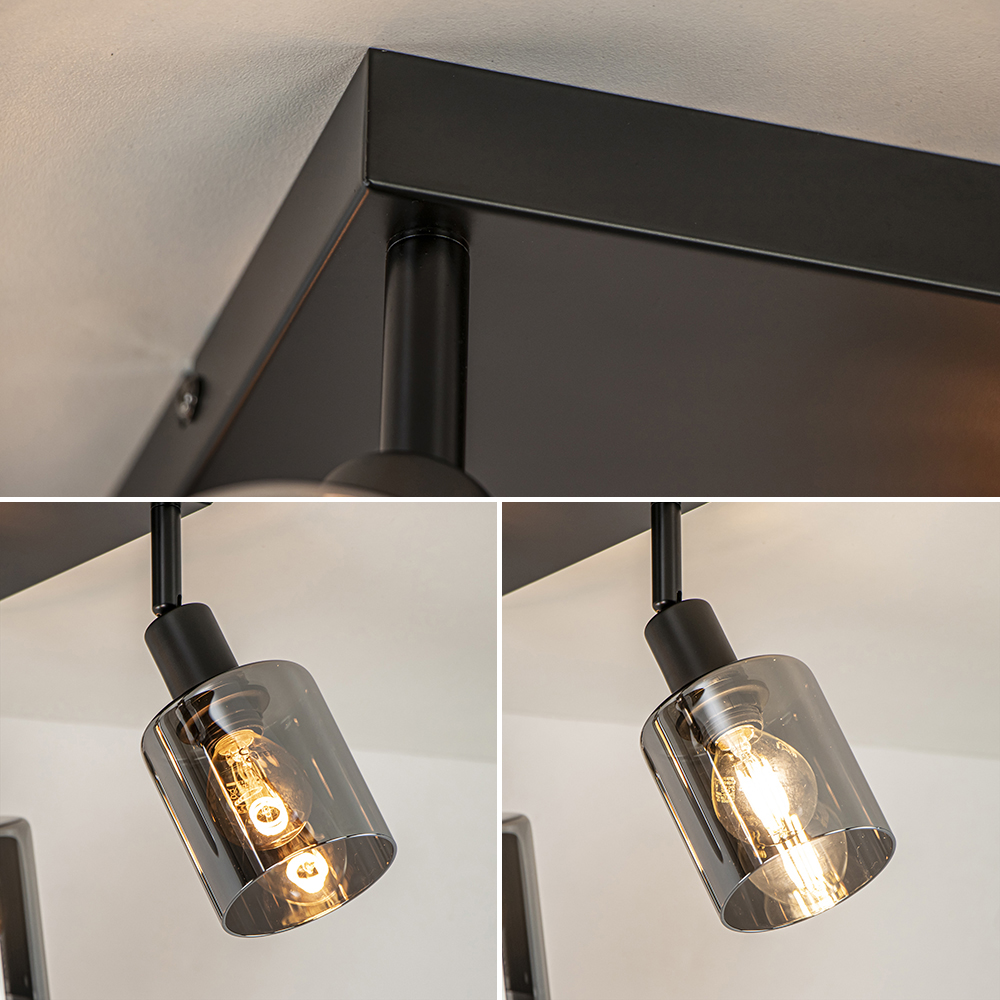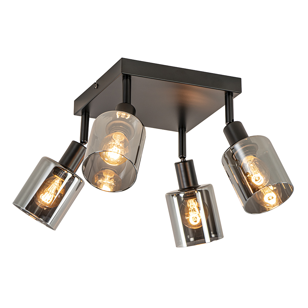 Chique 4-lichts plafondlamp zwart met smoke glas vierkant