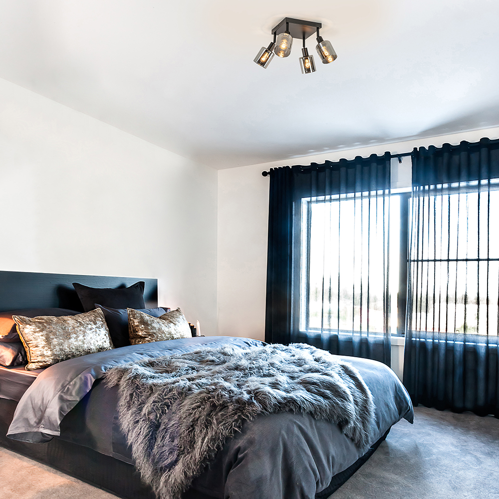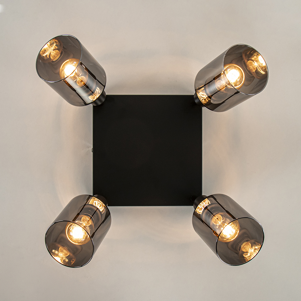 Perfect voor de woonkamer, slaapkamer of hal. Deze 4-lichts plafondlamp zorgt voor stijl en functie in de ruimte. De vierkante plafondlamp heeft een armatuur dat is gemaakt van metaal en uitgevoerd in het mat zwart. Dit is gecombineerd met smoke glazen kappen in de vorm van een cilinder. De kappen zijn verstelbaar door deze te kantelen en/of te draaien. De mat zwarte plafondlamp met smoke glas wordt geleverd exclusief lichtbronnen en is dimbaar middels een externe dimmer (exclusief).