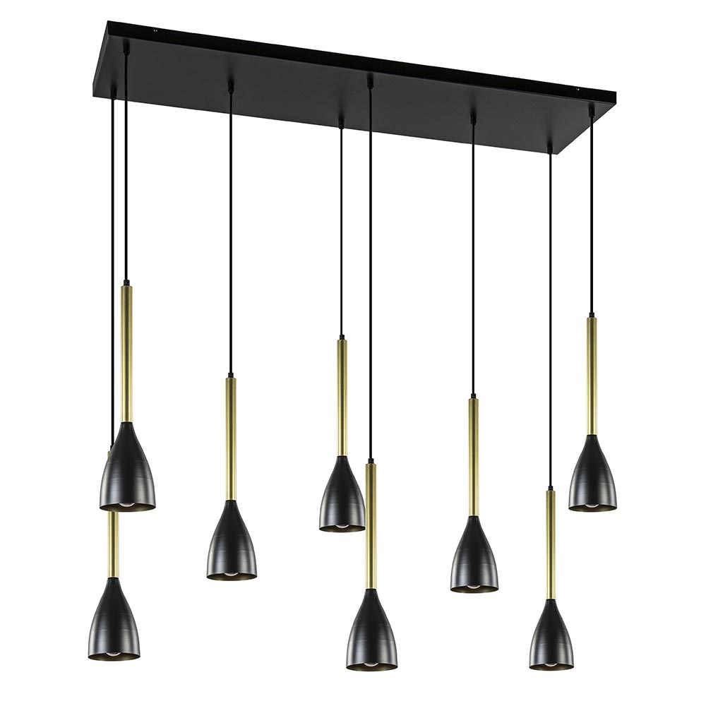 – hoogte: 140 cm – kappen: Ø11×48 cm – bevestiging: 110x30x3 cm – metaal – zwart / goud – exclusief lichtbron (8x E27) – dimbaar (exclusief)