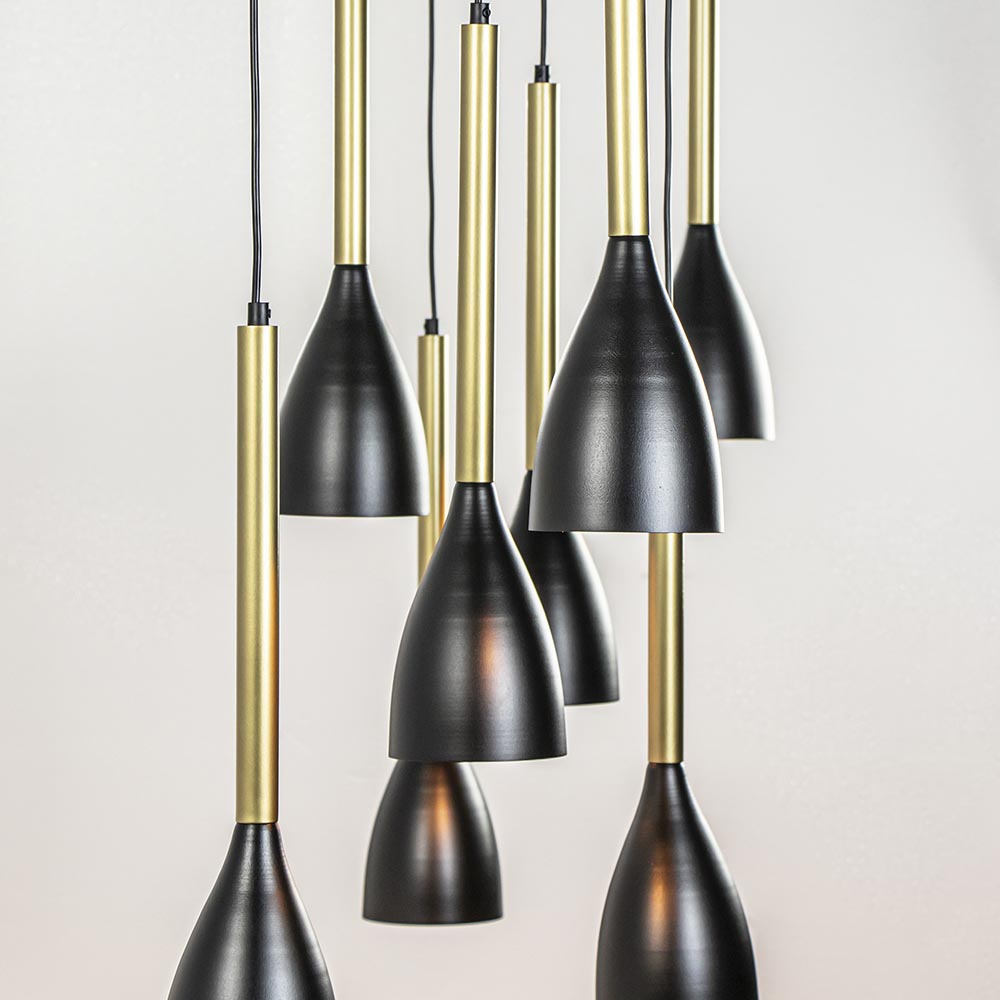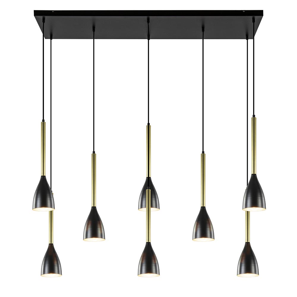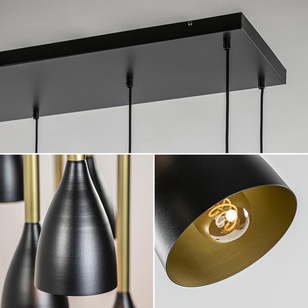 Deze chique hanglamp past helemaal binnen de huidige woontrends. De grote hanglamp heeft een flinke plafondplaat van 110×30 cm waar de snoeren mooi over zijn verdeeld. Aan ieder snoer hangt een zwart metalen kapje die aan de bovenzijde zijn afgewerkt met een gouden pijp. De combinatie van het zwart en goud geeft een extra chique uitstraling die wordt versterkt doordat de binnenzijde van de kap ook goudkleurig is. De snoeren zijn naar wens in te korten en de lamp heeft een maximale hoogte van 140 cm. Perfect voor boven een eettafel of kookeiland. Doordat de kapjes dicht zijn wordt het licht mooi naar beneden verspreid. De chique 8-lichts hanglamp zwart goud is dimbaar middels een externe dimmer (exclusief) en wordt geleverd zonder lichtbronnen (8x E27).