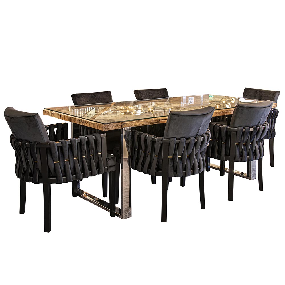 Met deze chique eetkamerstoel maakt u de eetkamer helemaal af. De luxe stoel heeft een hoogwaardig zitcomfort en is voorzien van mooie details. Zo heeft de armstoel een sierlijke leuning die verder doorloopt in de rug. In deze leuning is een gouden stang geplaatst waar de stof mooie doorheen is gevlochten. Dit geeft de stoel een luxe uitstraling wat wordt versterkt door de velourse stof. De poten zijn van hout en uitgevoerd in het zwart. Een verrijking voor de eetkamer en een genot om op te zitten.