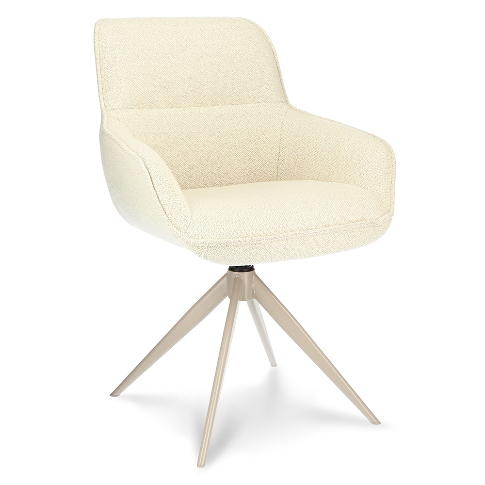 Deze trendy eetkamerstoel zorgt voor een fijn comfort tijdens het dineren. De stoel is draaibaar en is voorzien van een return-system zodat de stoel automatisch weer terugdraait. De armstoel heeft een stoffen zitting die is uitgevoerd in het naturel. Dit is verder mooi gecombineerd met een chique crème kleurige poot. Een echte uitblinker in de eetkamer.