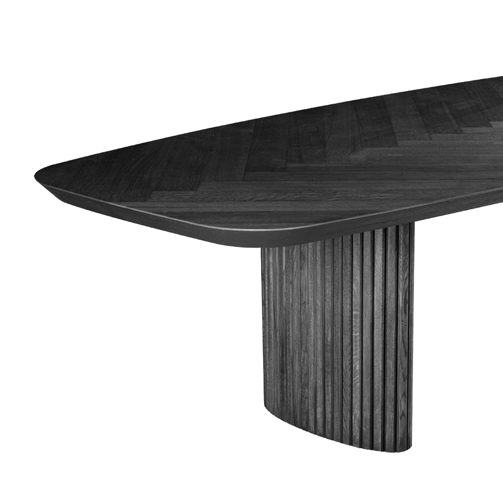 Deze prachtige tafel is een mooie aanvulling op een luxe of hotel chic interieur. De langwerpige tafel heeft een ovaal blad met walvisgraat en is gemaakt van eiken hout. Dit is uitgevoerd in het mat zwart wat de tafel een stoere en robuuste look geeft. De grove poot complementeert de look. Het blad heeft een afmeting van 260×100 cm is en 6 cm dik. Een stijlvolle tafel om heerlijk aan te dineren.