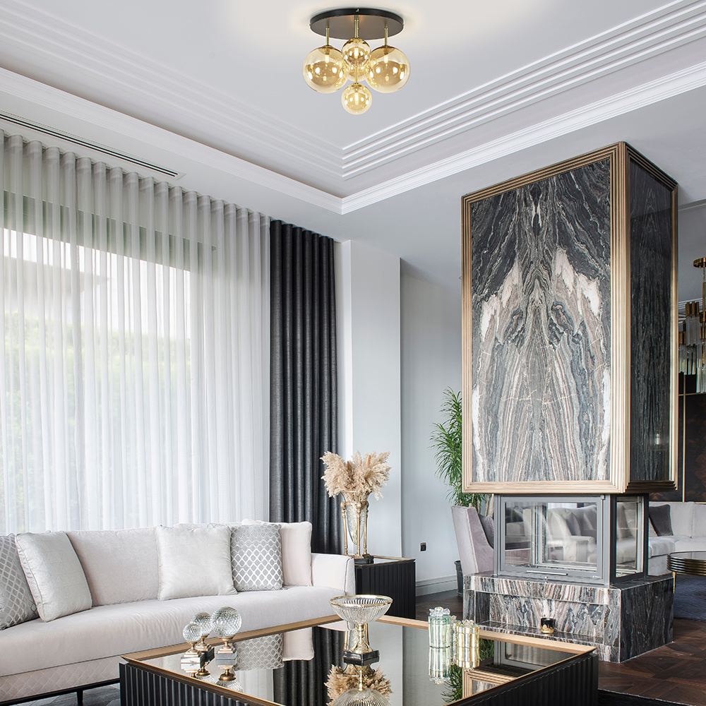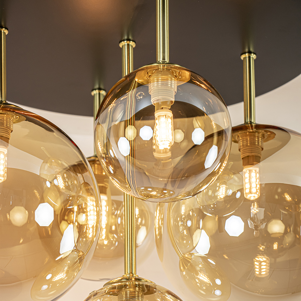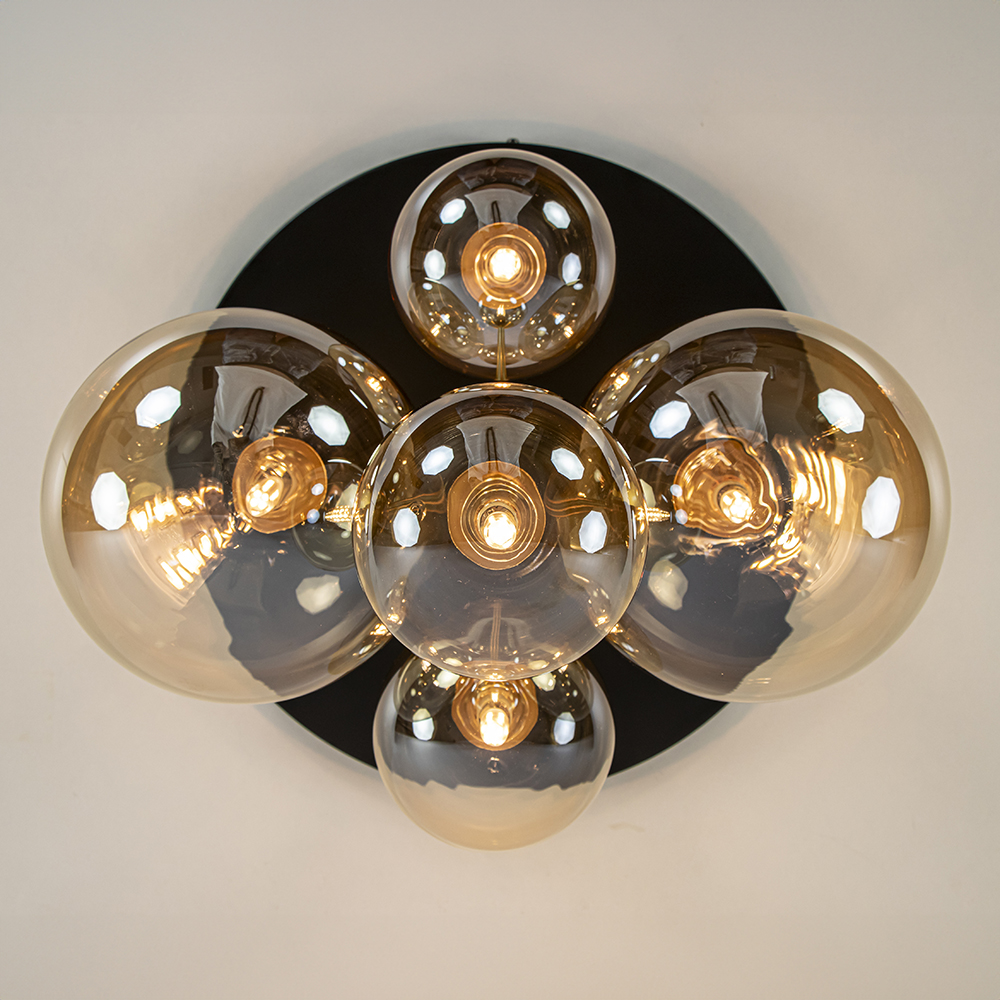 Chic, stijlvol en luxe ineen. Deze 5-lichts plafondlamp heeft het allemaal. Ideaal als eyecatcher in de woonkamer, slaapkamer of hal. De grote plafondlamp heeft een metalen armatuur dat is uitgevoerd in het zwart met goud. Dit is mooi gecombineerd met amber glazen bollen in twee afmetingen. De combinatie zorgt voor een retro Art Deco uitstraling die mooi matcht in de huidige woonstijlen. Iedere bol is voorzien van een G9 lichtpunt. De bollen worden hier gemakkelijk opgedraaid. Deze prachtige plafondlamp is een ware verrijking voor het interieur.