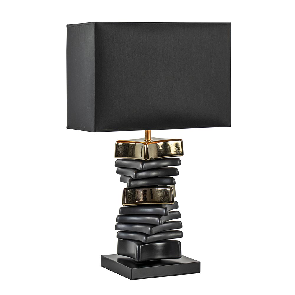 Deze stijlvolle tafellamp is een prachtig exemplaar voor op een dressoir, bijzettafel of zelfs het nachtkastje. Ga voor een chique hotel look in het interieur met deze zwarte tafellamp met goud accenten. De schemerlamp heeft een keramieken voet die is opgebouwd uit losse delen. Doordat deze verspringen ontstaat er een speels design wat, mede door het goud dat erin verwerkt is, een luxe uitstraling heeft. De voet is gecombineerd met een rechthoekige zwarte kap met gouden binnenzijde. De stijlvolle tafellamp heeft een zwart snoer met een lengte van 150 cm en een schakelaar op 30 cm. De lichtbron is exclusief.